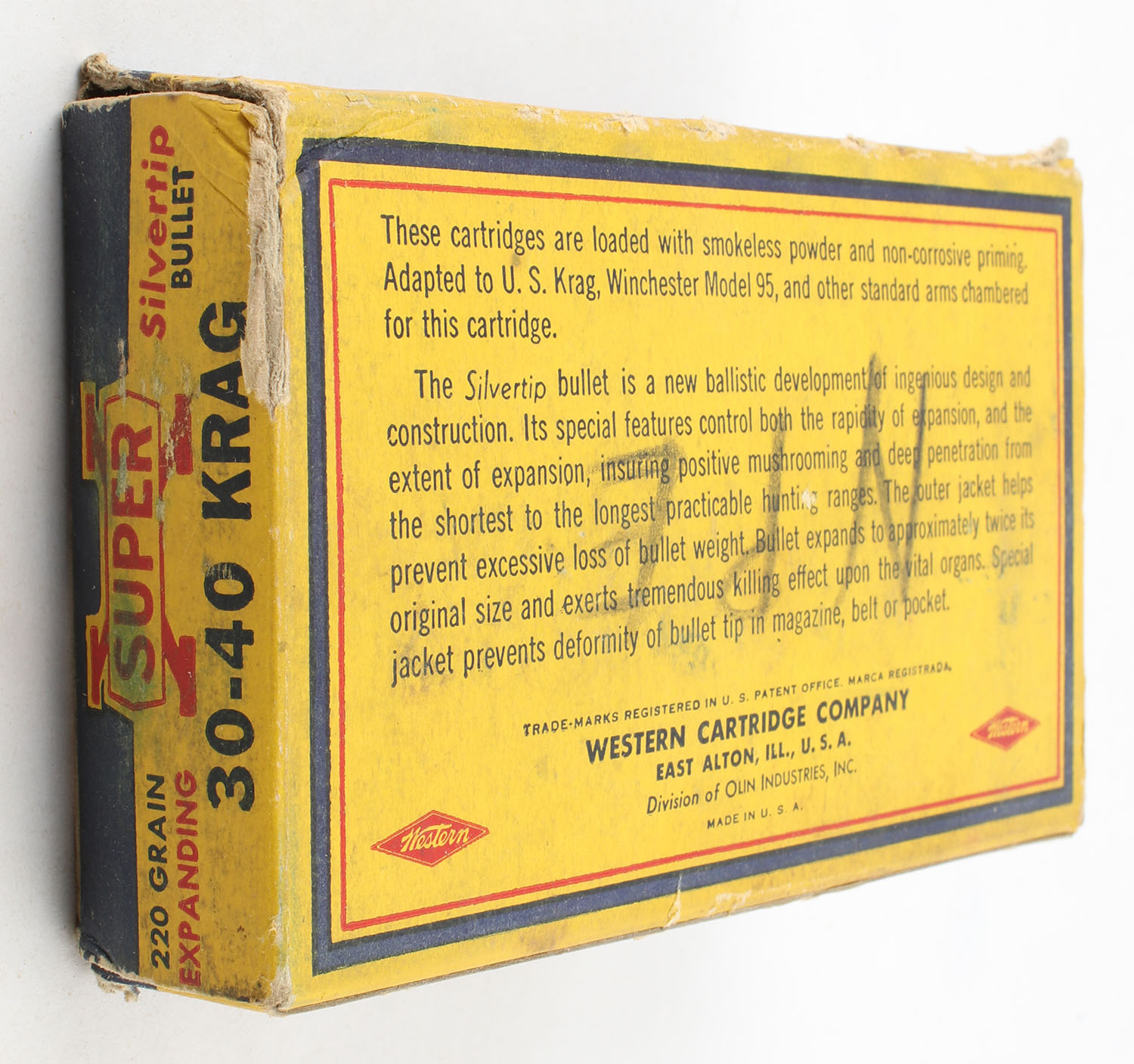 Western, Super-X Silvertip, .30-40 Krag, 220 Grain Controlled Expanding Bullet, Full, 1pc. Yellow blue & red bear box, box is solid with excellent color, has edge & corner wear, light scuffing, end flaps are solid, ammo is excellent. Grade: Excellent - Value: 80 to 140