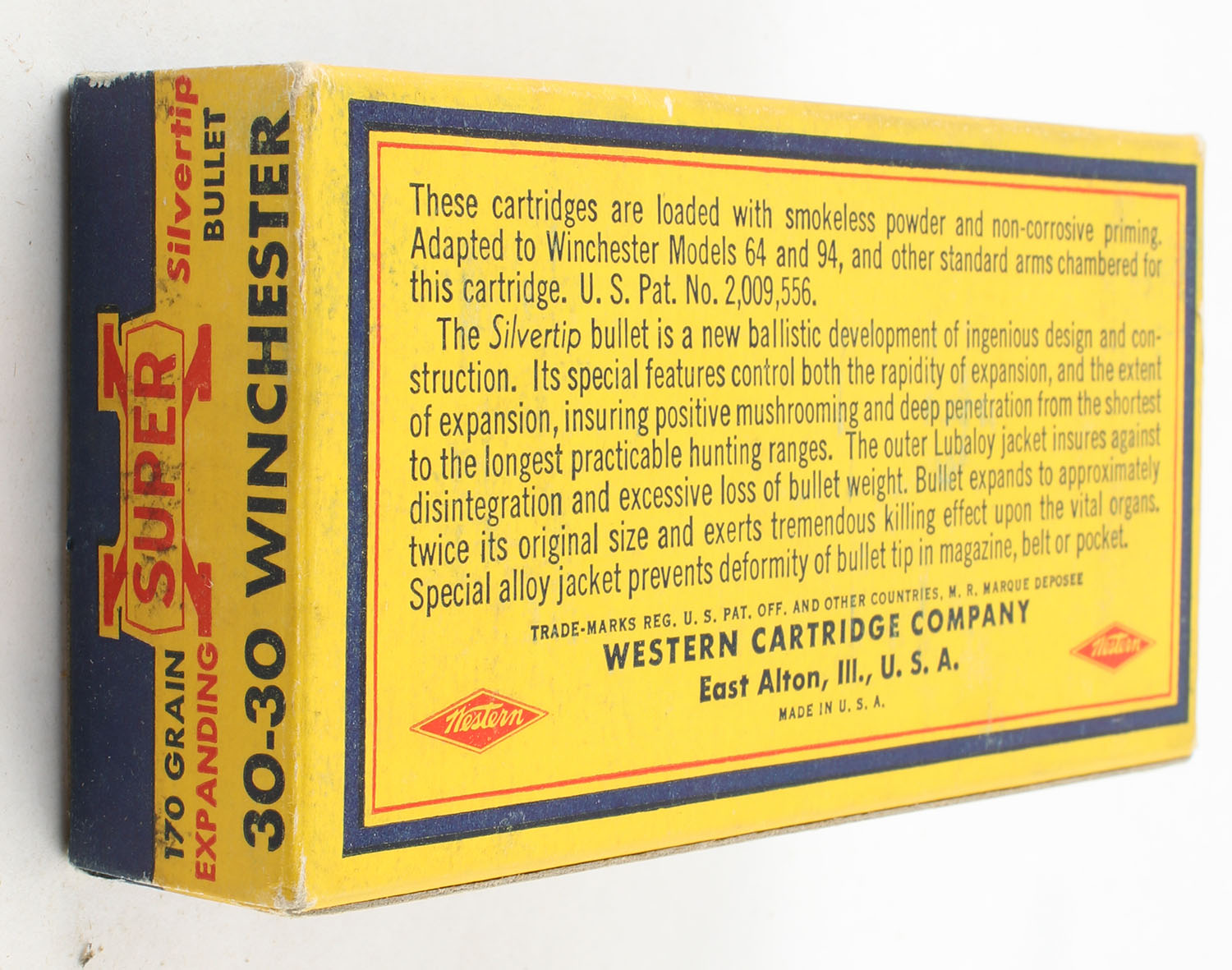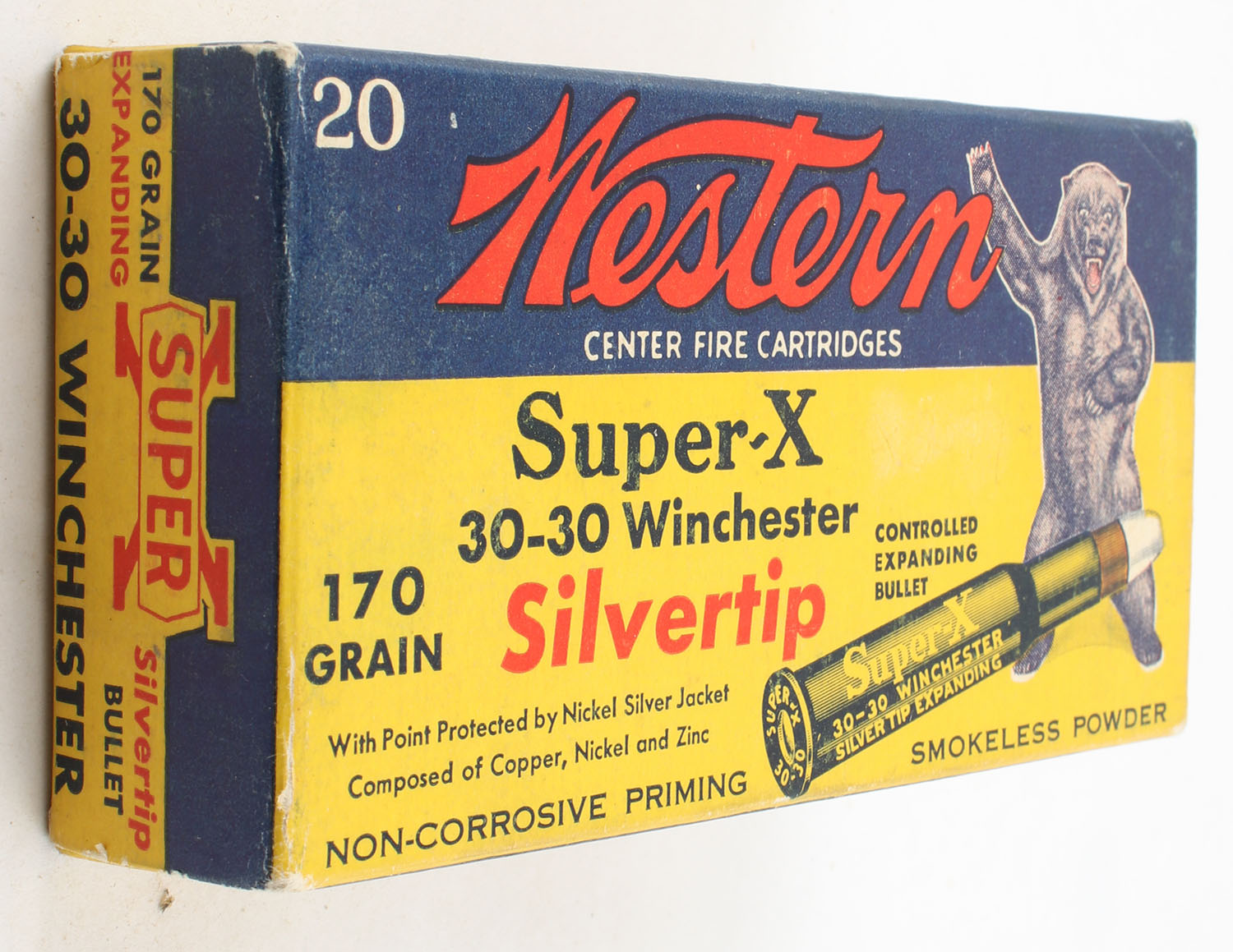 Western, Super-X Silvertip, .30-30 Winchester, 170 Grain Controlled Expanding Bullet, Full, 1pc. Yellow blue & red bear box, box is very solid with excellent color, has very minor corner wear, end flaps are solid, ammo is very good. Grade: Excellent - Value: 80 to 120