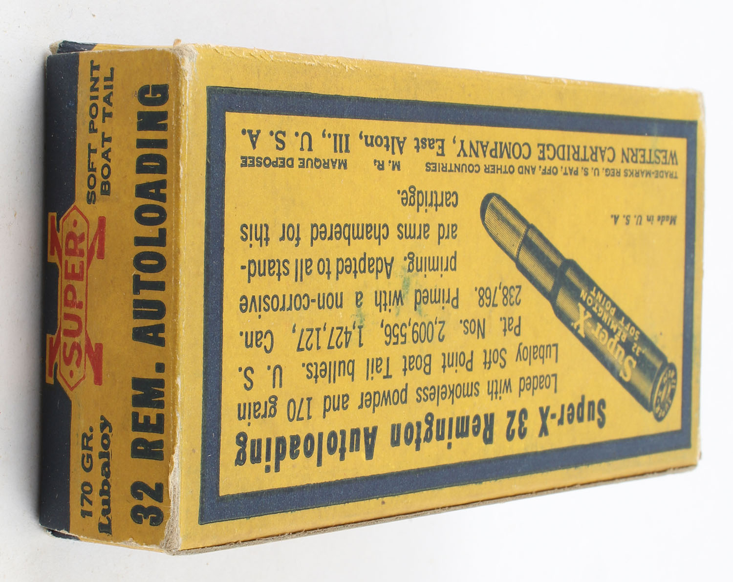 Western, Super-X, .32 Remington Autoloading, 170 Grain Boat Tail Lubaloy Soft Point Bullet, Full, 1pc. Yellow blue & red box, box is solid with excellent color, has light scuffing with edge & corner wear, end flaps are solid, ammo is excellent. Grade: Excellent - Value: 40 to 80