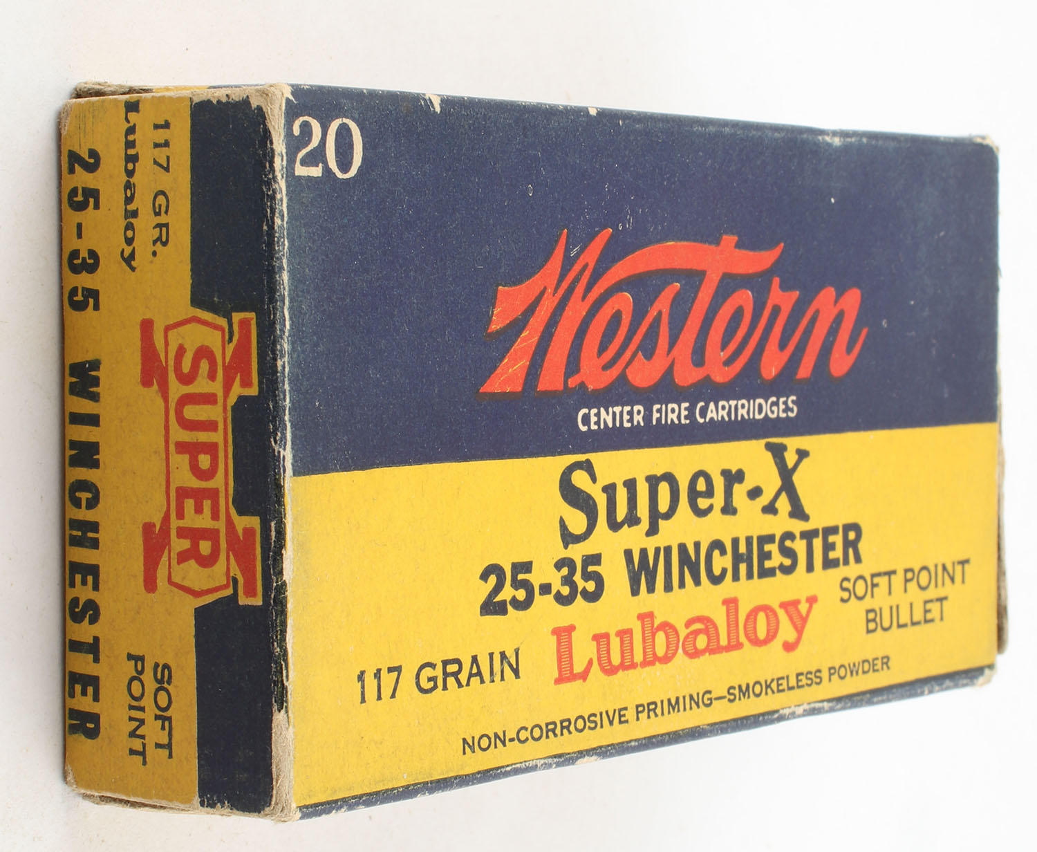 Western, Super-X, .25-35 Winchester, 117 Grain Lubaloy Soft Point Bullet, Full, 1pc. Yellow blue & red box, box is solid with excellent color, has minor edge & corner wear, left end flap is solid, right end flap is torn, ammo is excellent. Grade: Very Good ++ - Value: 50 to 75