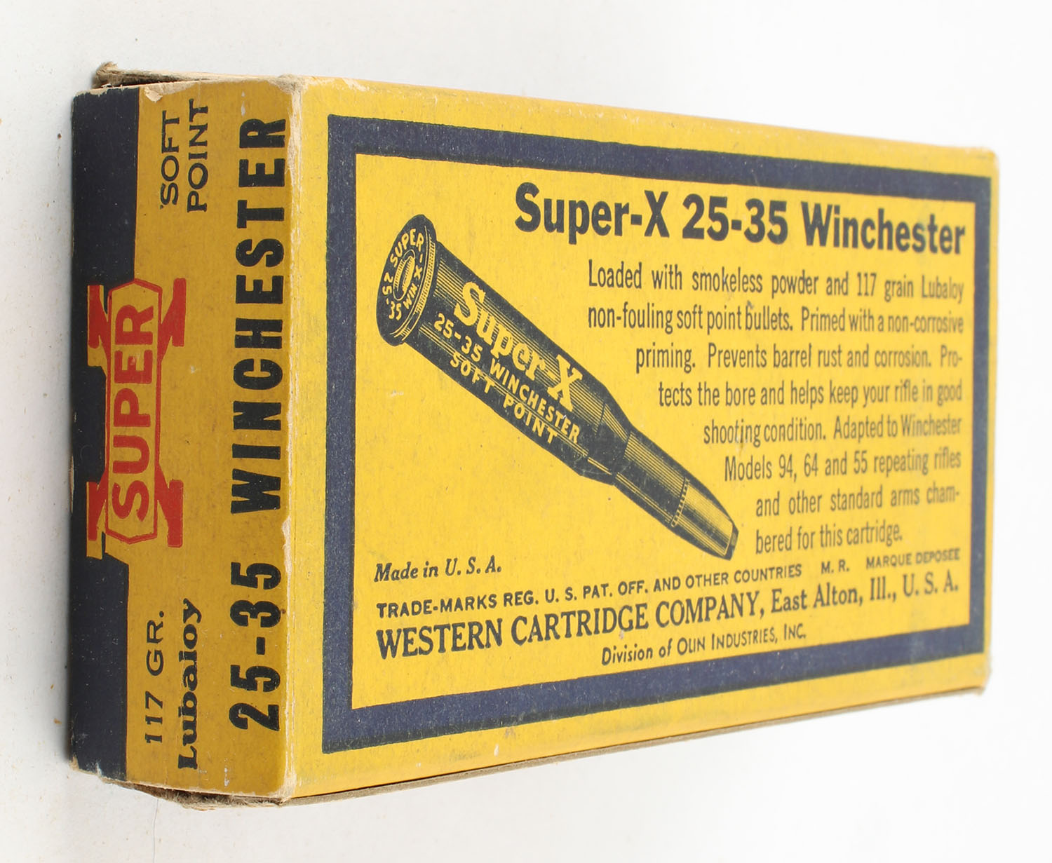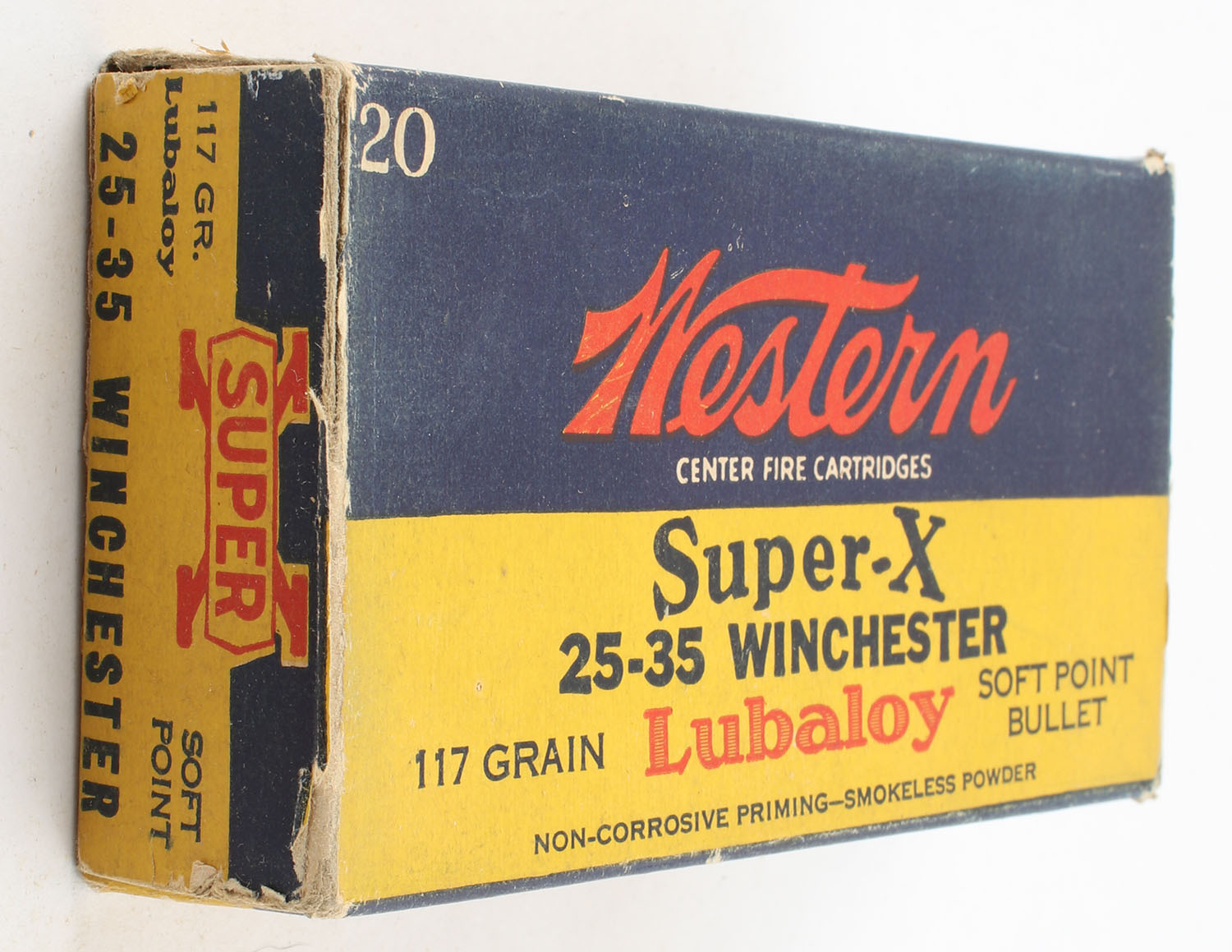 Western, Super-X, .25-35 Winchester, 117 Grain Lubaloy Soft Point Bullet, Full, 1pc. Yellow blue & red box, box is solid with excellent color, has very minor edge & corner wear, end flaps are solid, ammo is excellent. Grade: Excellent - Value: 50 to 75