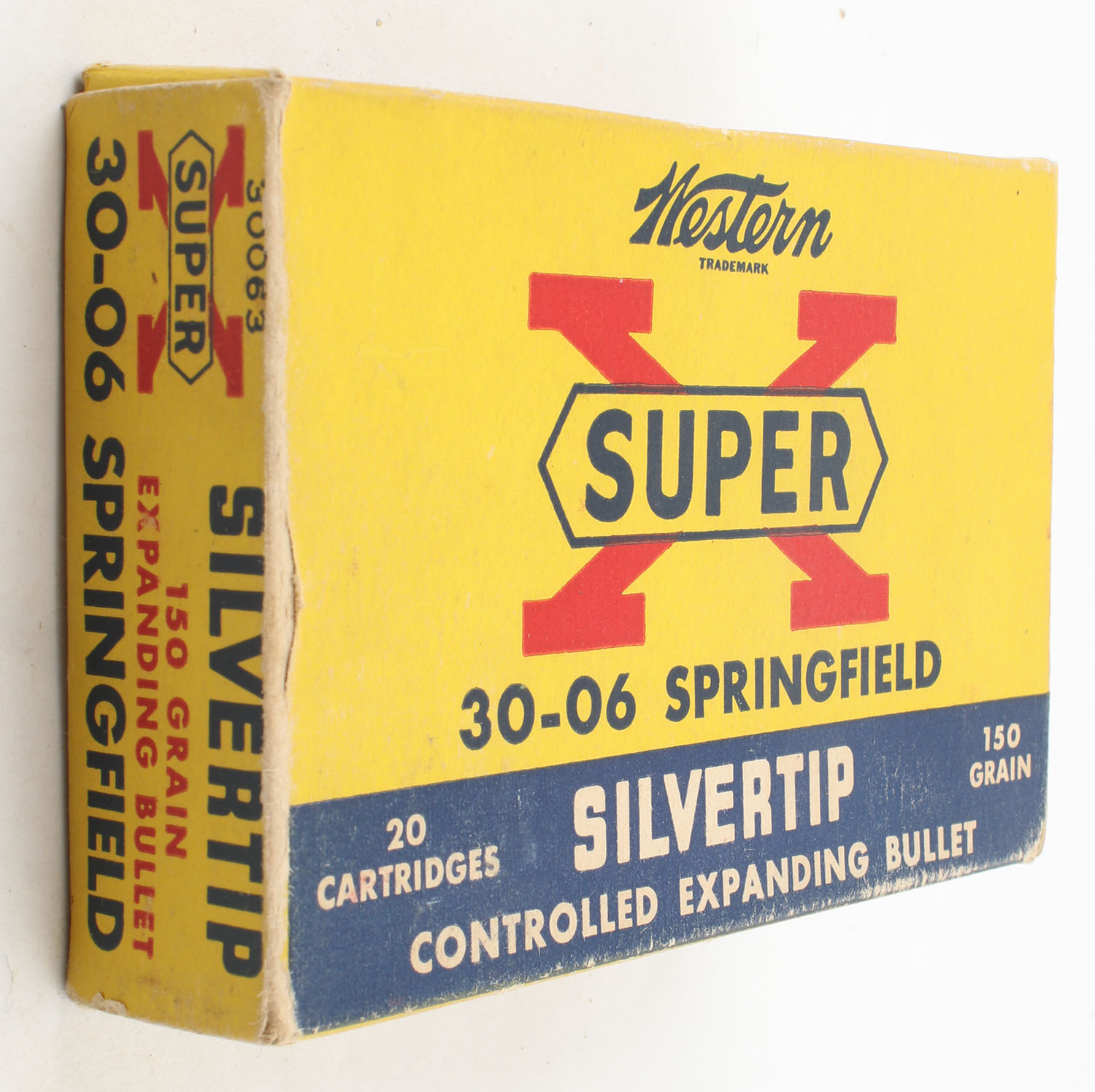 Western, Super X Silvertip, .30-06 Springfield, 150 Grain Controlled Expanding Bullet, Full, 1pc. Yellow blue & red box, box is very solid with excellent color, has light edge & corner wear, end flaps are solid, ammo is excellent. Grade: Excellent + - Value: 20 to 60
