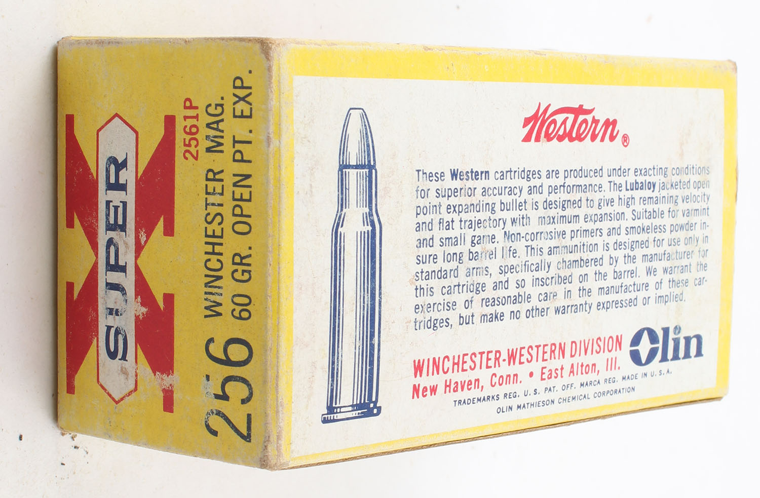 Western, Super X, .256 Winchester Magnum, 60 Grain Open Point Expanding, Full, 1pc. Yellow white & red box, box is solid with very good color, has light age soiling, light edge & corner wear, end flaps are solid, ammo is excellent. Grade: Excellent - Value: 100 to 150