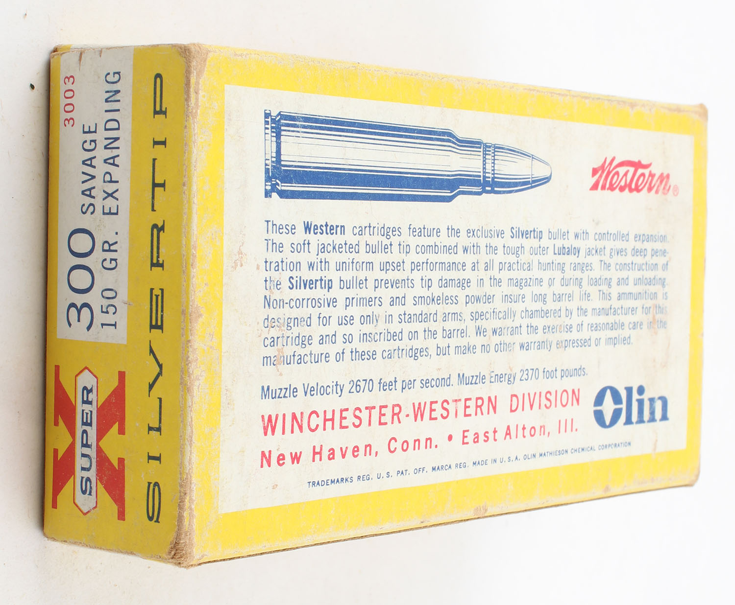Western, Super X Silvertip, .300 Savage, 150 Grain Expanding Bullet, Full with 15rds. Being correct, 1pc. Yellow white & red box, box is solid with good color, box has scuffing, light edge & corner wear, end flaps are solid, ammo is excellent. Grade: Very Good ++ - Value: 20 to 60