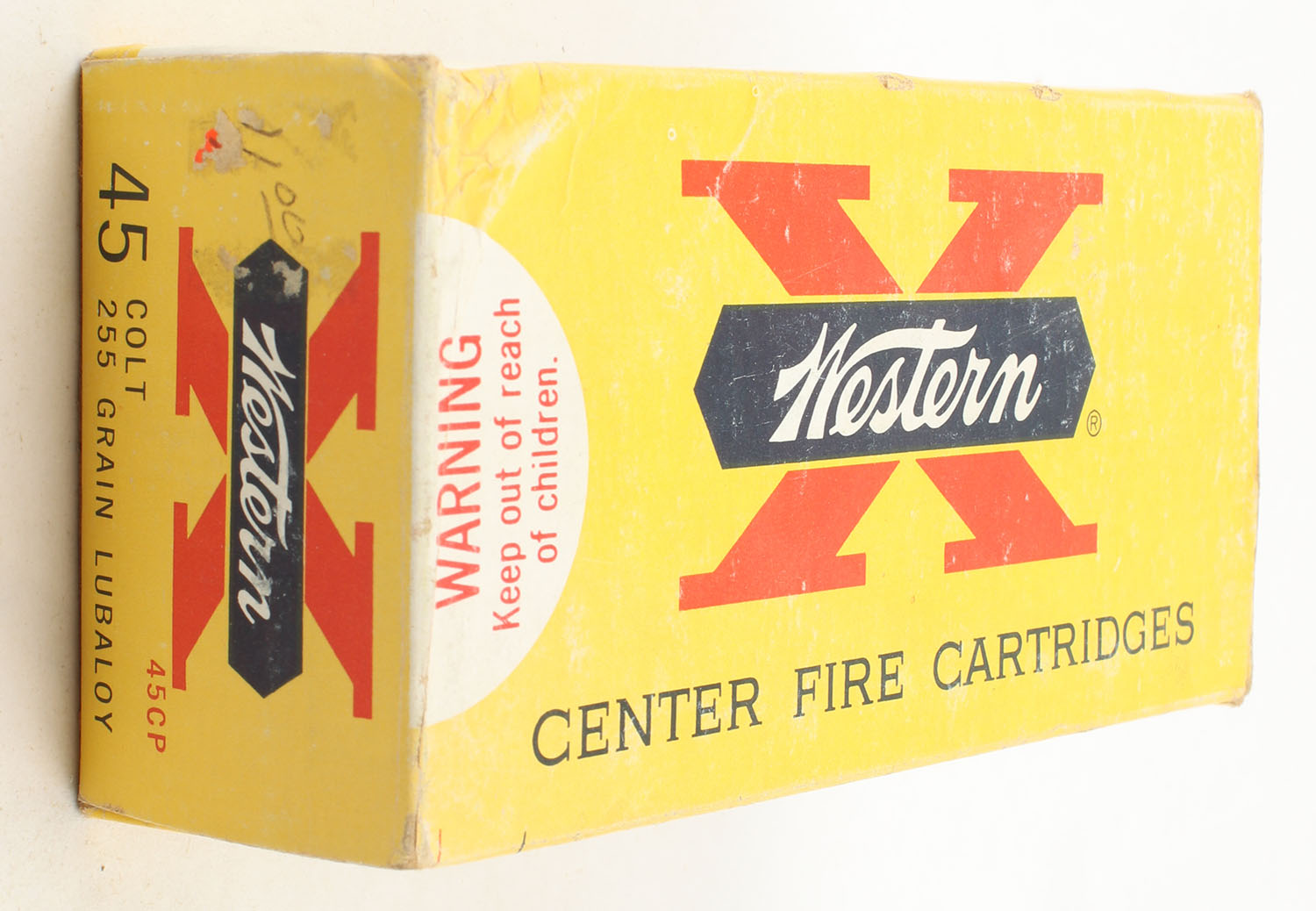 Western, X, .45 Colt, 255 Grain Lubaloy, Partial 34rds., 1pc. Yellow white & red box, box is solid with excellent color, minor shelf wear, light corner wear, end flaps are solid, ammo is excellent. Grade: Excellent - Value: 20 to 60
