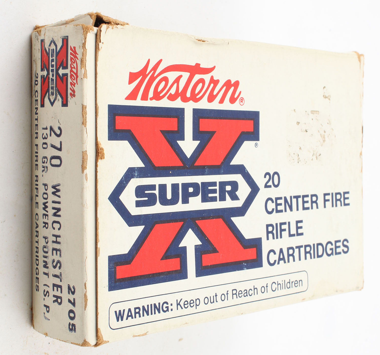 Western, Super X, .270 Winchester, 130 Grain Power Point, Full, 1pc. White red & black box, box is solid with very good color, has edge & corner wear, shelf wear, end flaps are solid, ammo is excellent. Grade: Very Good ++ - Value: 16 to 24