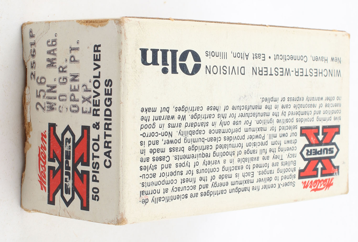 Western, Super-X, .256 Winchester Magnum, 60 Grain Open Point Expansion, Full, 1pc. White red & black box, box is solid with very good color, minor age soiling, edge & corner wear, end flaps are solid, ammo is excellent. Grade: Very Good ++ - Value: 80 to 120