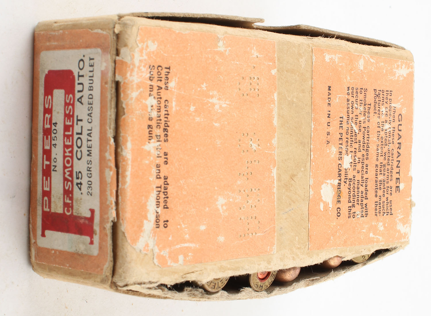 Peters, C.F. Cartridges, Smokeless, .45 Colt, 230 Grain Metal Cased, Full, 2pc. Buff box with red & orange labels, box is very solid with excellent color, has light shelf wear, partial seam split to bottom, light edge & corner wear, labels are intact, ammo is excellent. Grade: Very Good ++ - Value: 40 to 100