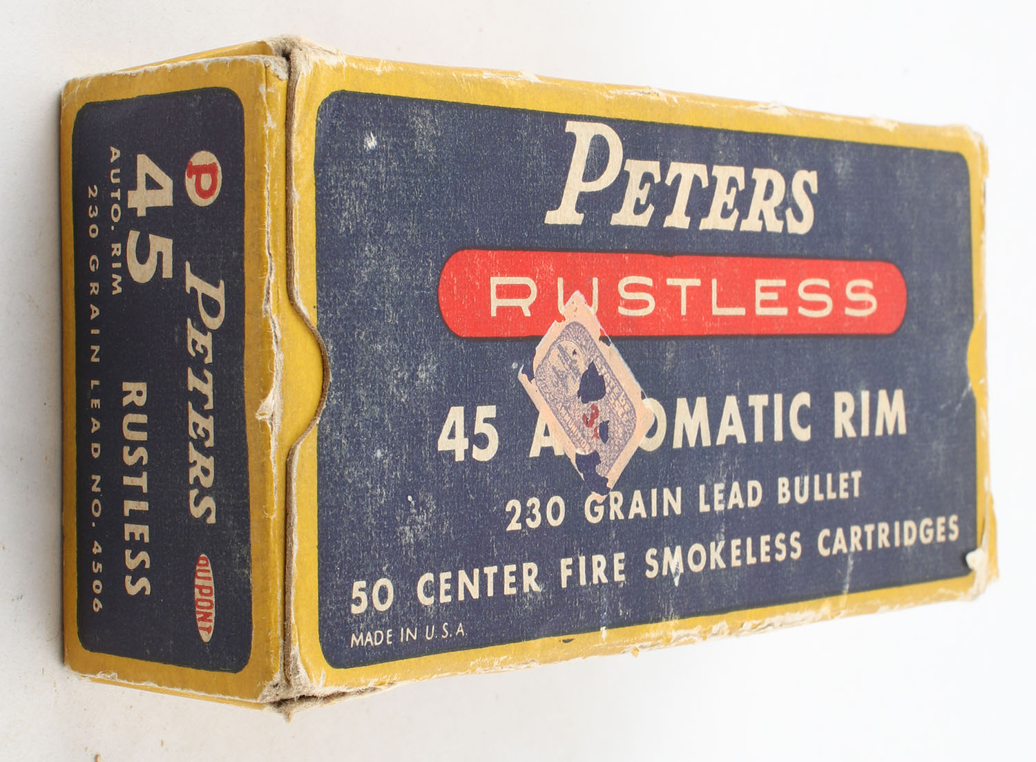 Peters, Rustless, .45 Automatic Rim, 230 Grain Lead, Full, 1pc. Blue yellow & red box, box is solid with good color, has minor age soiling, edge & corner wear, end flaps are solid, ammo is excellent. Grade: Very Good - Value: 20 to 80