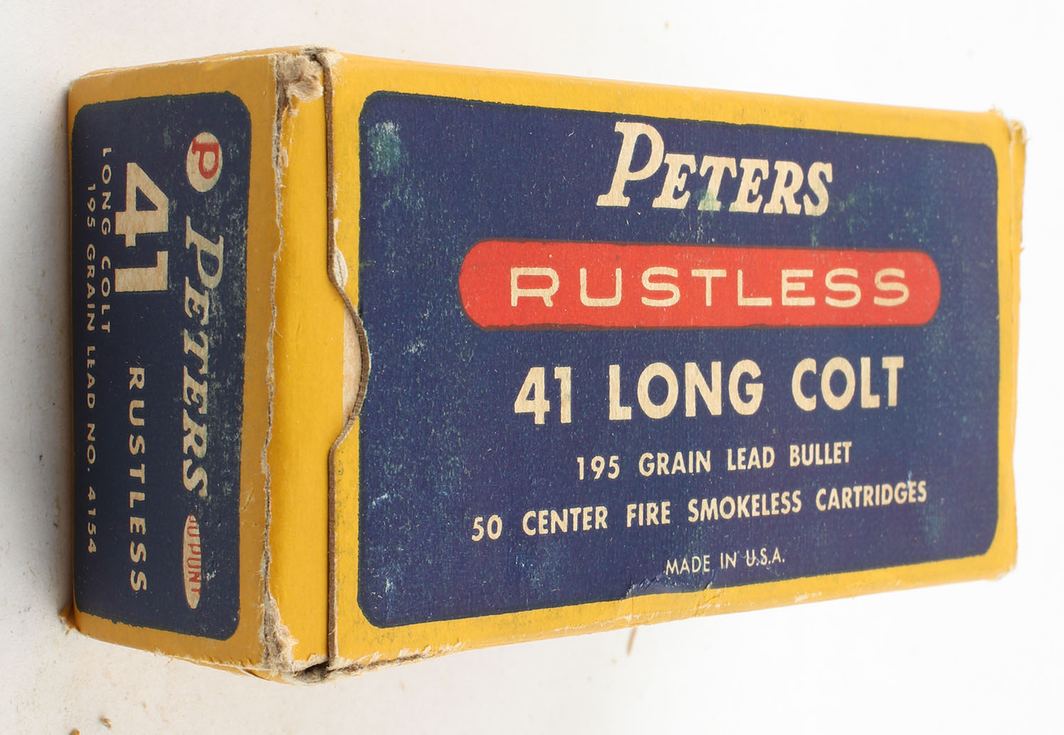 Peters, Rustless, .41 Long Colt, 195 Grain Lead Bullet, Full, 1pc. Yellow blue & red box, box is very solid with excellent color, has light shelf wear, very minor corner wear, end flaps are solid, ammo is excellent. Grade: Excellent - Value: 80 to 120