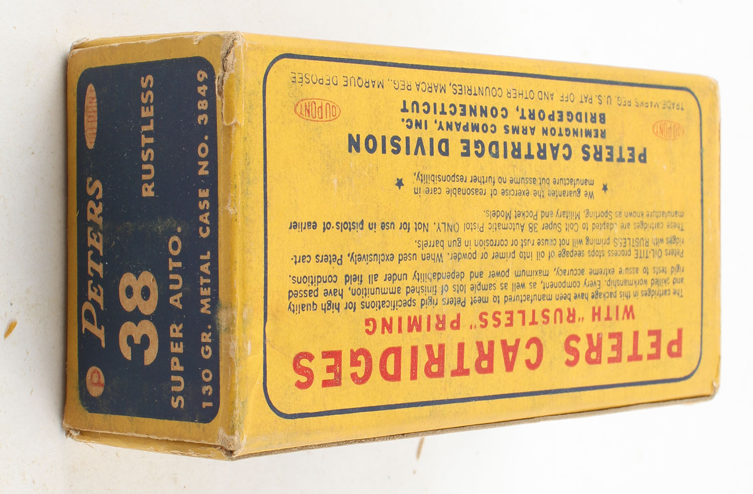 Peters, Rustless, .38 Super Auto., 130 Grain Metal Case Bullet, Full, 1pc. Blue yellow & red box, box is solid with excellent color, minor shelf wear, some corner wear, very minor edge wear, end flaps are solid, ammo is excellent. Grade: Excellent - Value: 50 to 75