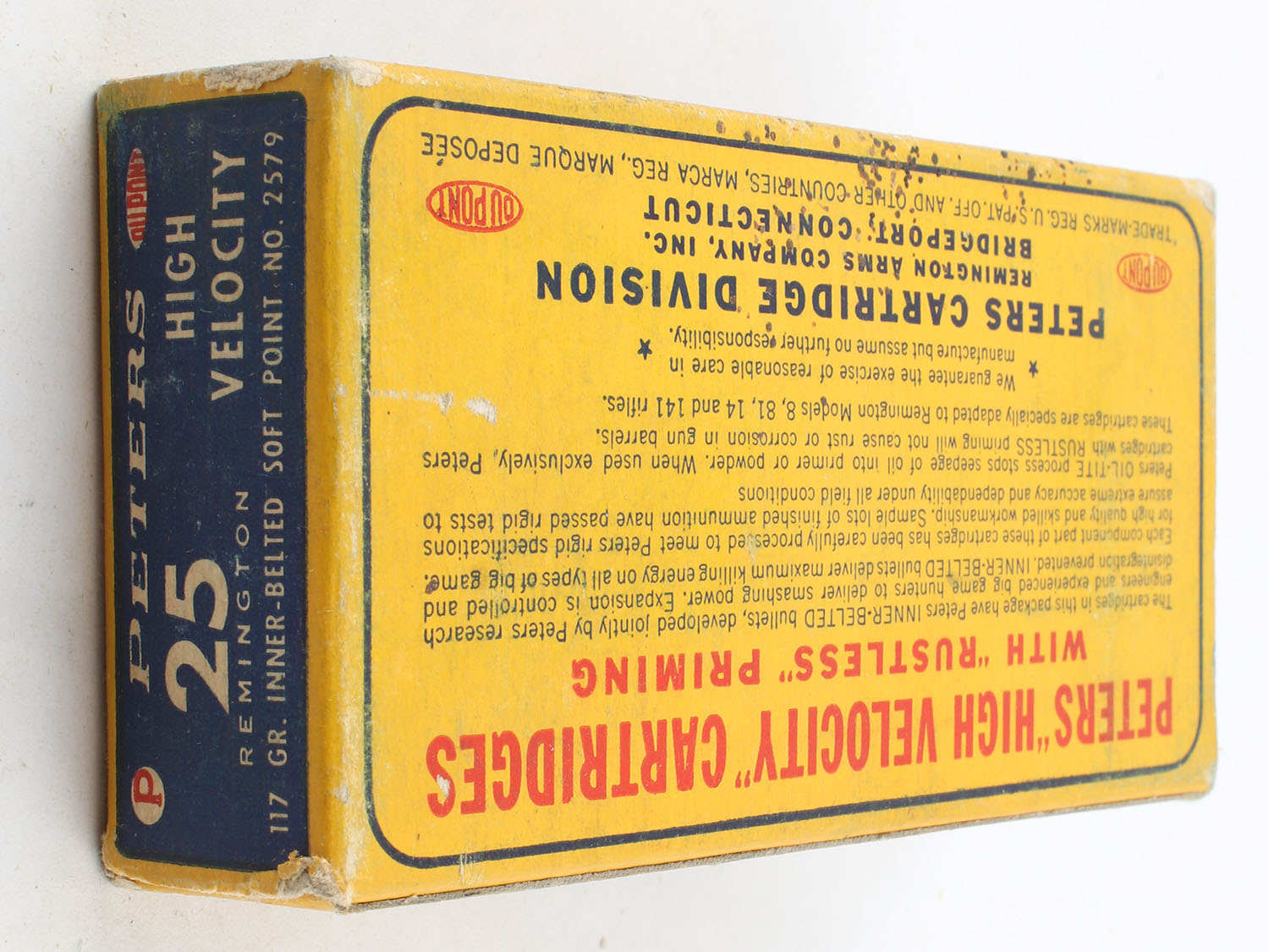 Peters, High Velocity, .25 Remington, 117 Grain Inner-Belted Soft Point Bullet, Full, 1pc. Blue yellow & red box, box is very solid with very good color, has scuffing with minor corner wear, end flaps are solid, ammo is excellent. Grade: Excellent - Value: 50 to 75