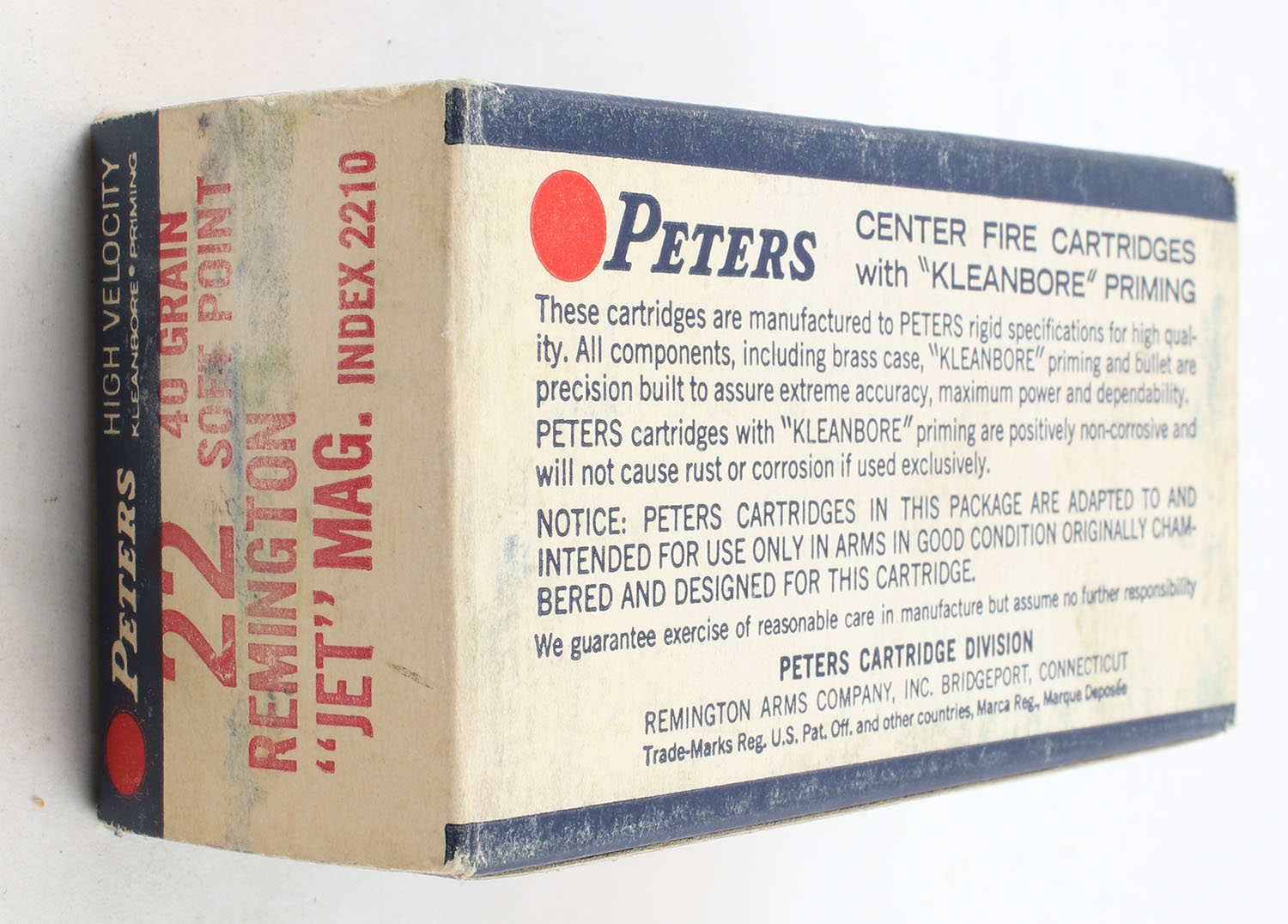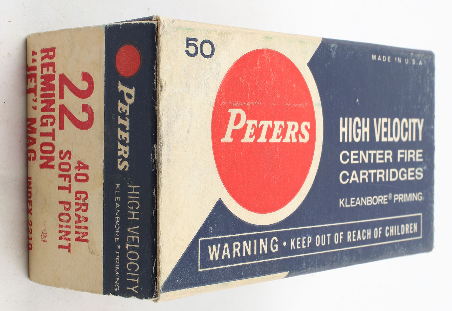 Peters, High Velocity, .22 Remington Jet Mag., 40 Grain Soft Point, Full, 1pc., Blue white & red box, box is solid with vey good color, has light edge & corner wear, light scuffing, end flaps are solid, ammo is excellent. Grade: Very Good ++ - Value: 60 to 100