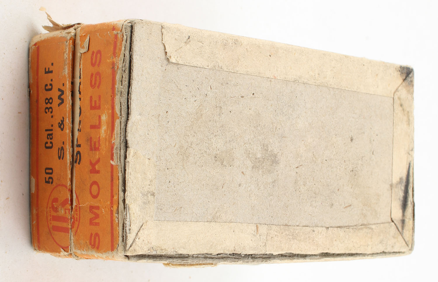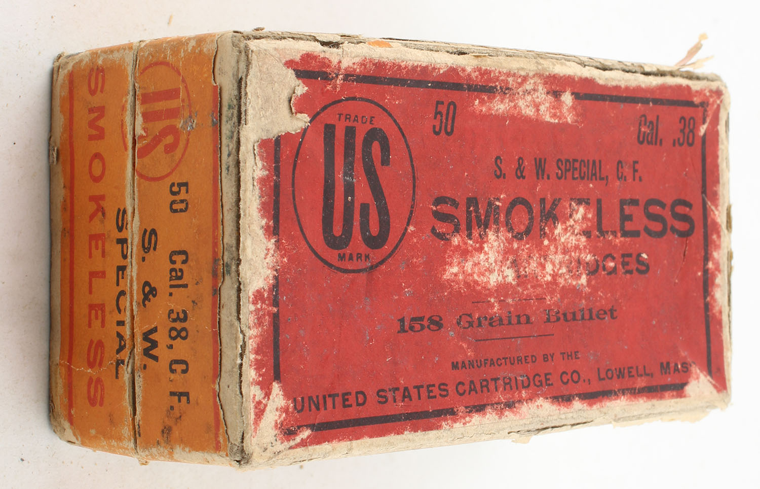 U.S., Smokeless Central Fire Cartridges, .38 Smith & Wesson Special, 158 Grain, Full, 2pc. Buff box with red top & orange side sealing label, box has seam splits to top & bottom, scuffing with light age soiling, corner & edge wear, ammo is excellent. Grade: Good ++ - Value: 30 to 90