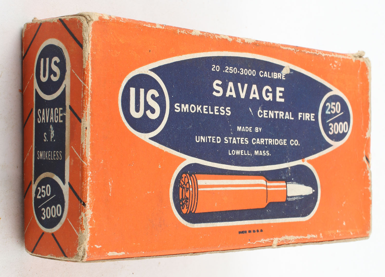 U.S. Cartridge Co., .250-3000 Savage, Smokeless Central Fire, Full, 1pc. Orange & blue box, box is solid with excellent color, has edge & corner wear, light scuffing, end flaps are solid, ammo is excellent. Grade: Very Good + - Value: 20 to 40