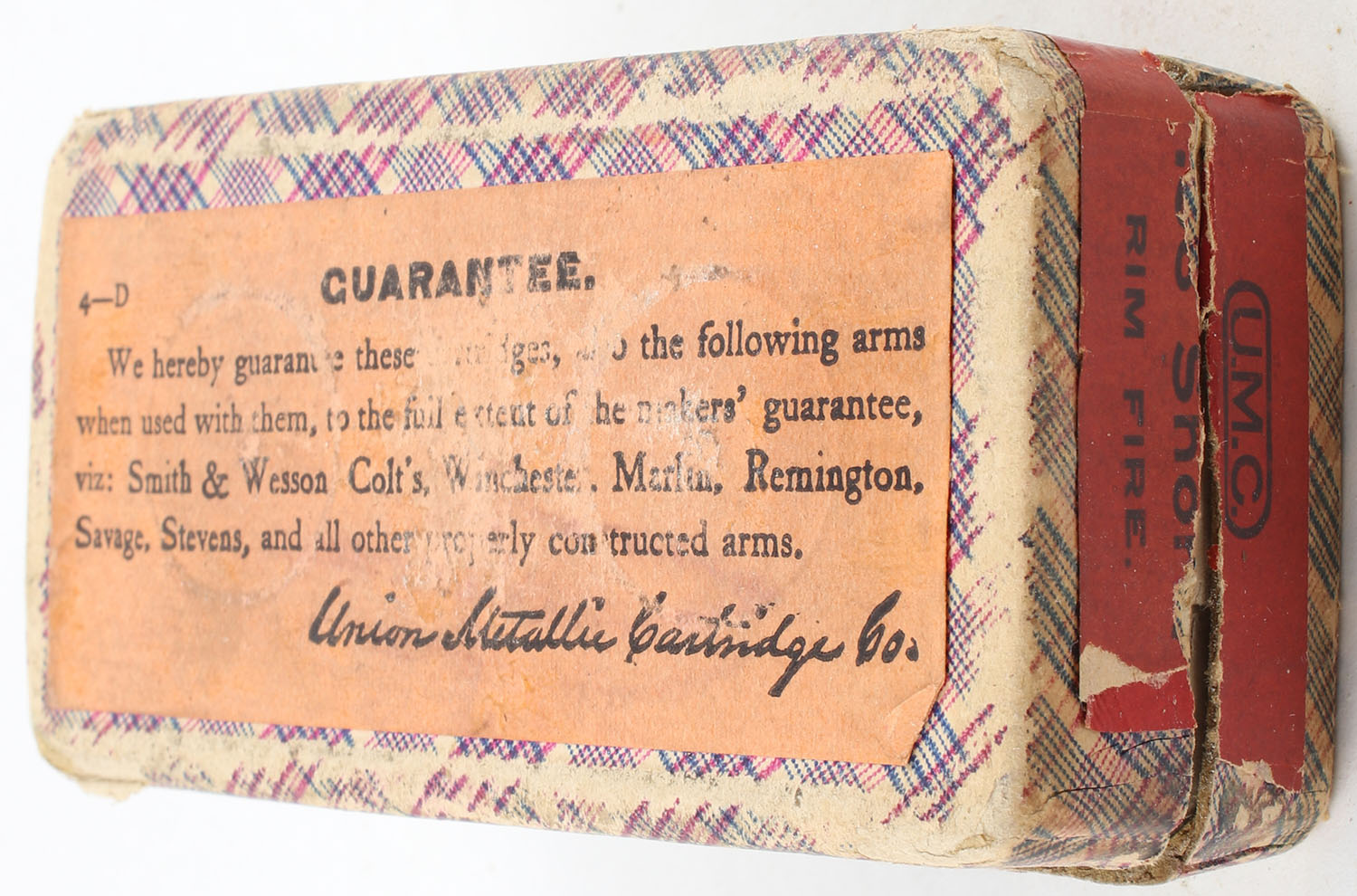 UMC, Rim-Fire Cartridges, .38 Short Rim Fire, Swaged Bullets, Partial 41rds. Mixed H/S, 2pc. Purple fabric box with blue top & red side sealing label, box is solid with very good color, has light age soiling, edge wear, side label is 50% intact, ammo is fair. Grade: Good ++ - Value: 10 to 40