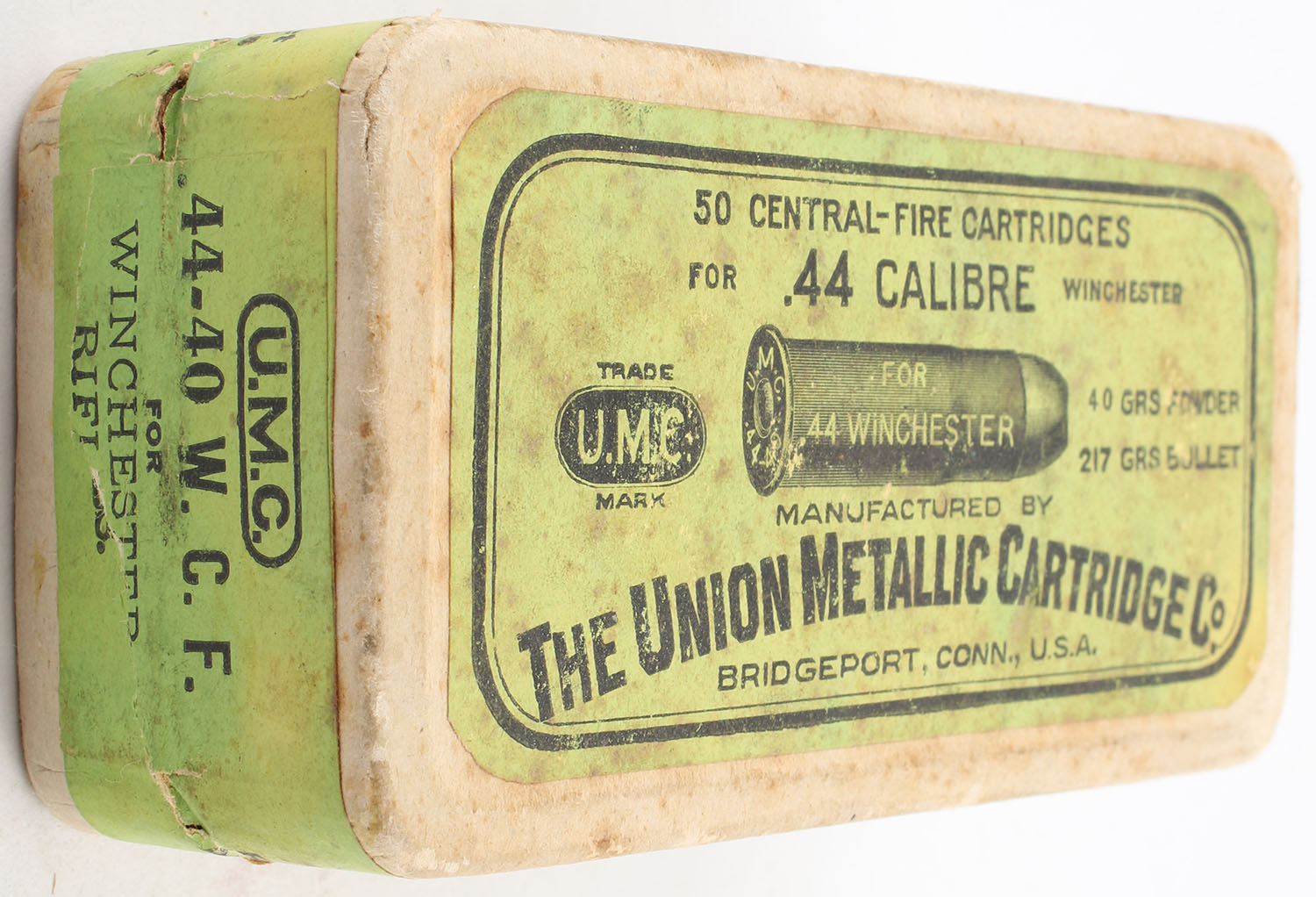 U.M.C., Central-Fire Cartridges, .44 Winchester, 40 Grains Powder, 217 Grain Bullet, Full, 2pc. Buff box with green top & side sealing labels, box is solid with very good color, has light age soiling, minor edge wear, labels are intact, ammo is very good. Grade: Very Good ++ - Value: 100 to 200