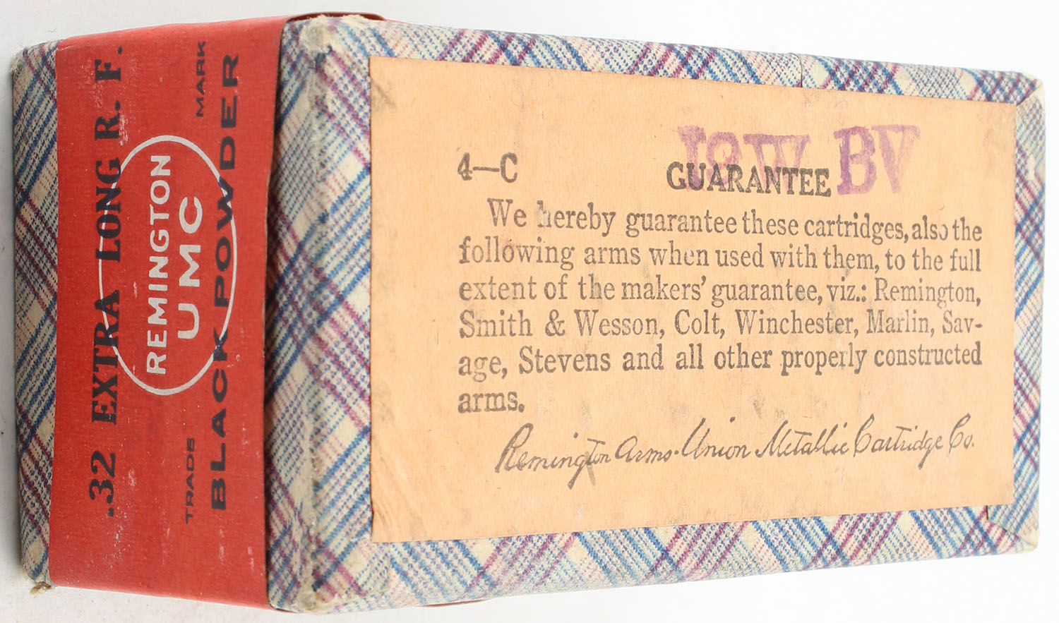 REM-UMC, .32 Extra Long Rim Fire, Black Powder, FULL & SEALED, 2pc. Blue fabric box with green top & red side sealing labels, box is very solid with excellent color, very minor corner wear, edges are sharp & crisp, labels are intact. Grade: Excellent ++ - Value: 50 to 150