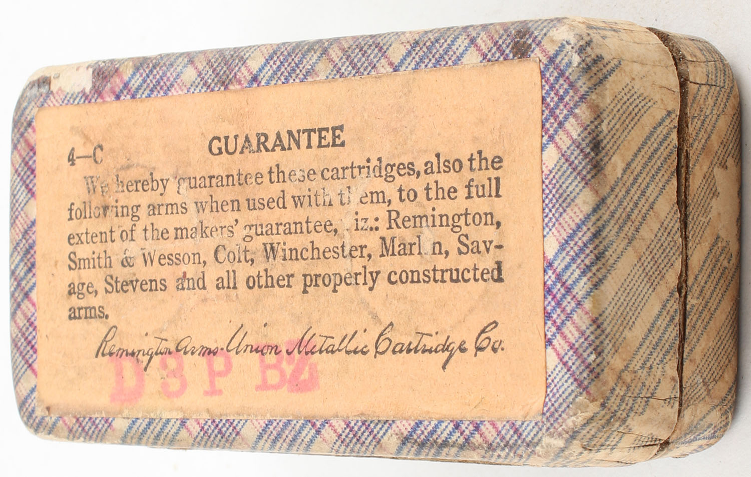 REM-UMC, .32 Short Rim Fire, Full, 2pc. Blue fabric box with red top & side sealing labels, box is solid with very good color, age soiling, shelf wear, edge & corner wear, labels are intact, ammo is very good. Grade: Very Good + - Value: 30 to 90