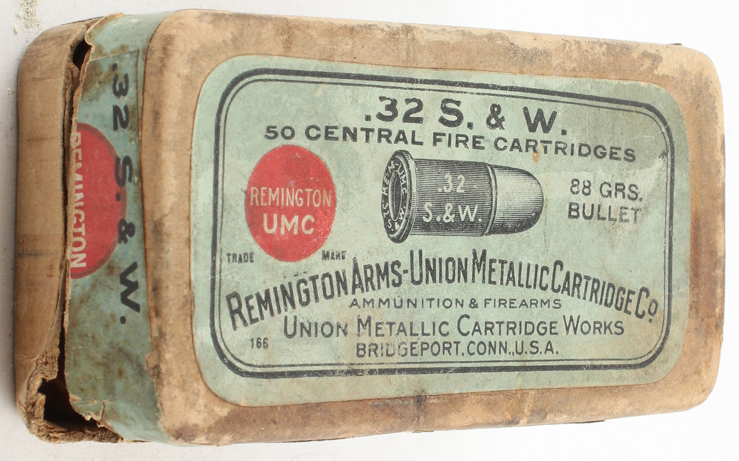 REM-UMC, Central Fire Cartridges, .32 Smith & Wesson, 88 Grain Bullet, Full, 2pc. Buff box with blue top & side sealing labels, box has age soiling, scuffing, edge & corner wear, side sealing label is partially torn, ammo is very good. Grade: Very Good - Value: 10 to 40