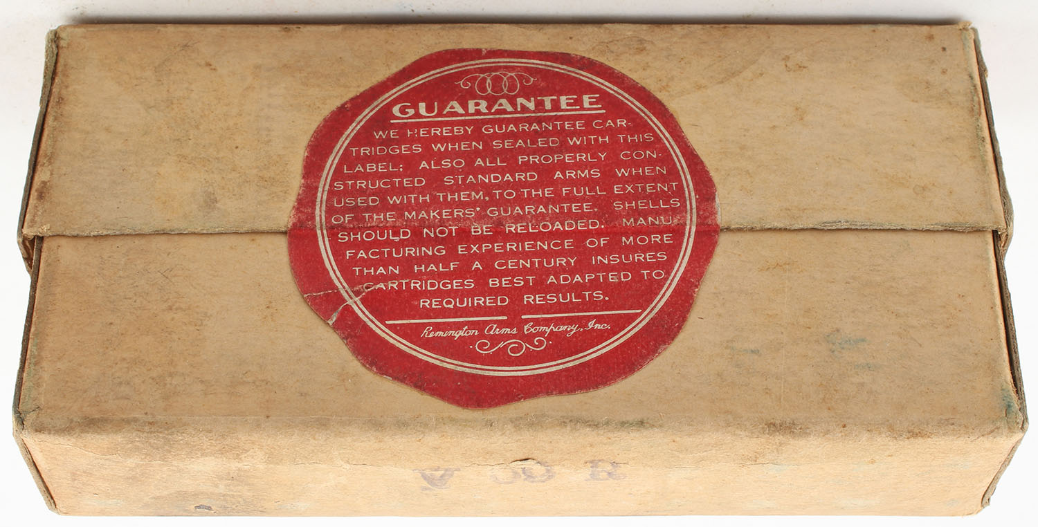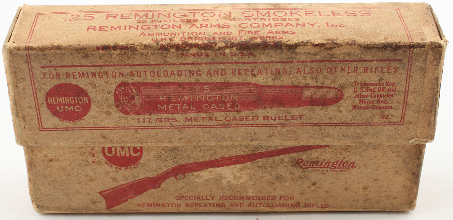 REM-UMC, Rimless C.F. Cartridges, .25 Remington, 117 Grain Metal Cased Bullet, Smokeless, FULL & SEALED, 2pc. Buff box with buff & red label, box is solid with very good color, some age soiling & color fading, light edge & corner wear, labels are intact. Grade: Excellent - Value: 20 to 60