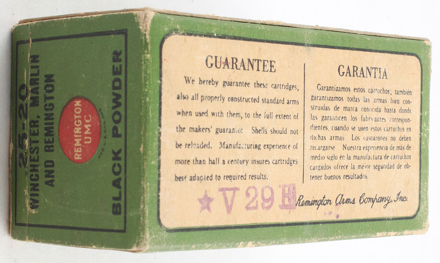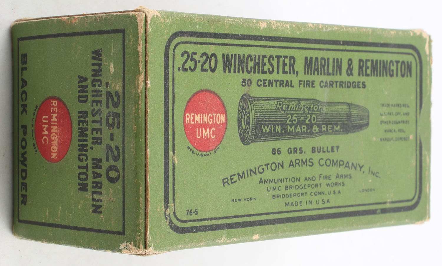 REM-UMC, Central Fire Cartridges, .25-20 Winchester, Marlin & Remington, 86 Grain Bullet, Black Powder, Full 1pc. Green black & red box, box is very solid with excellent color, has light edge & corner wear, light shelf wear, end flaps are solid, ammo is excellent. Grade: Excellent - Value: 80 to 150