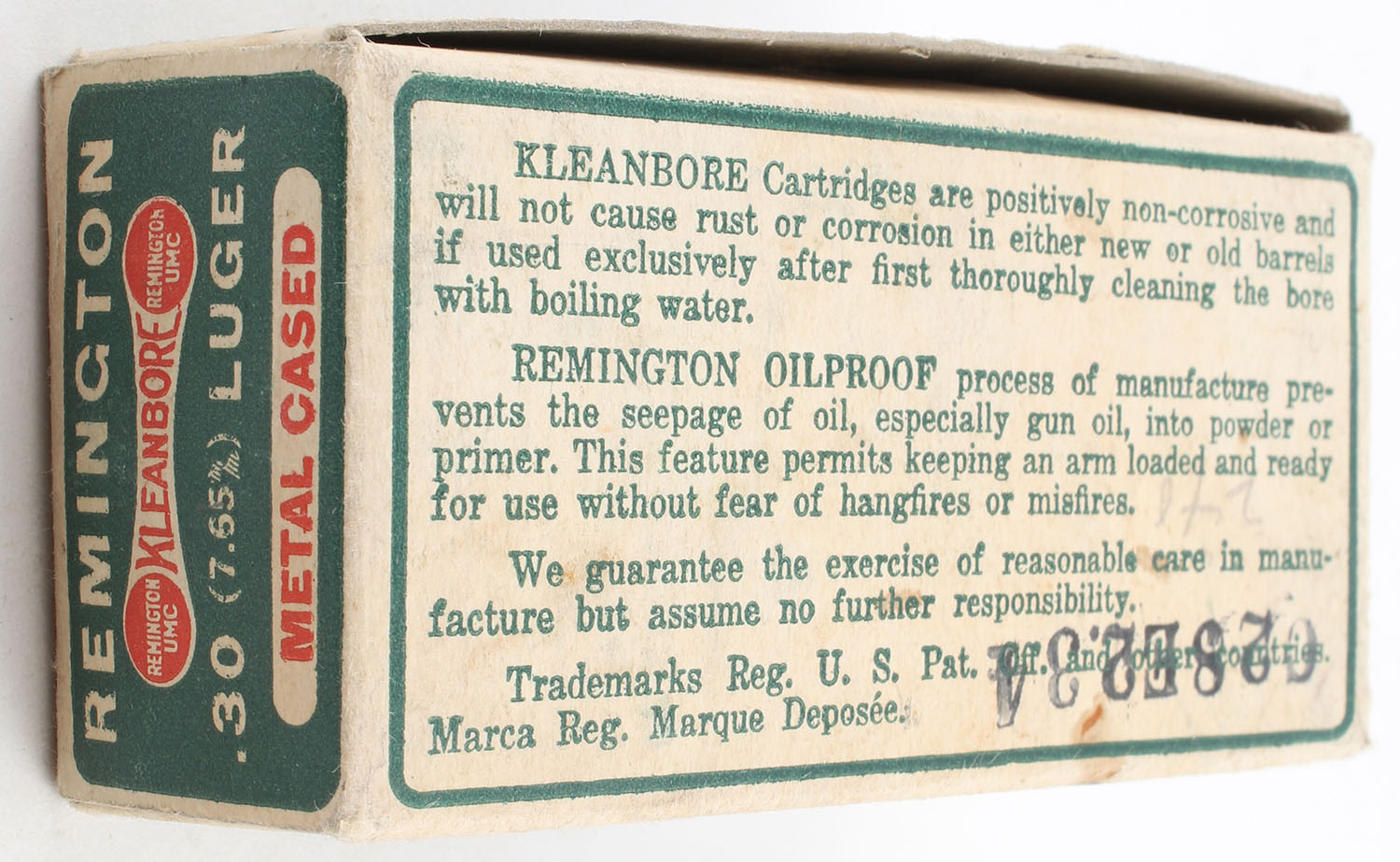 Remington, Kleanbore, .30 (7.65) LUGER, 93 Grain Metal Cased Bullet, Full, 1pc. Green buff & red dog bone box, box is very solid with excellent color, light edge & corner wear, light scuffing, end flaps are solid, ammo is excellent. Grade: Very Good ++ - Value: 20 to 60