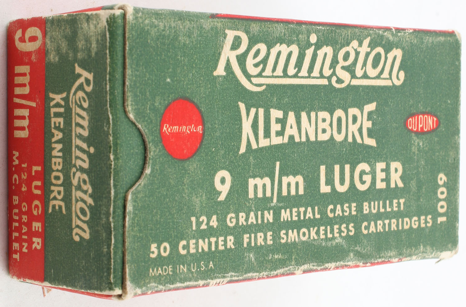 Remington, Kleanbore, 9mm Luger, 124 Gr. Metal Case Bullet, Full, 1pc. Green red & white box, box is solid with very good color, has light scuffing, light edge & corner wear, end flaps are solid, ammo is excellent. Grade: Very Good ++ - Value: 10 to 40