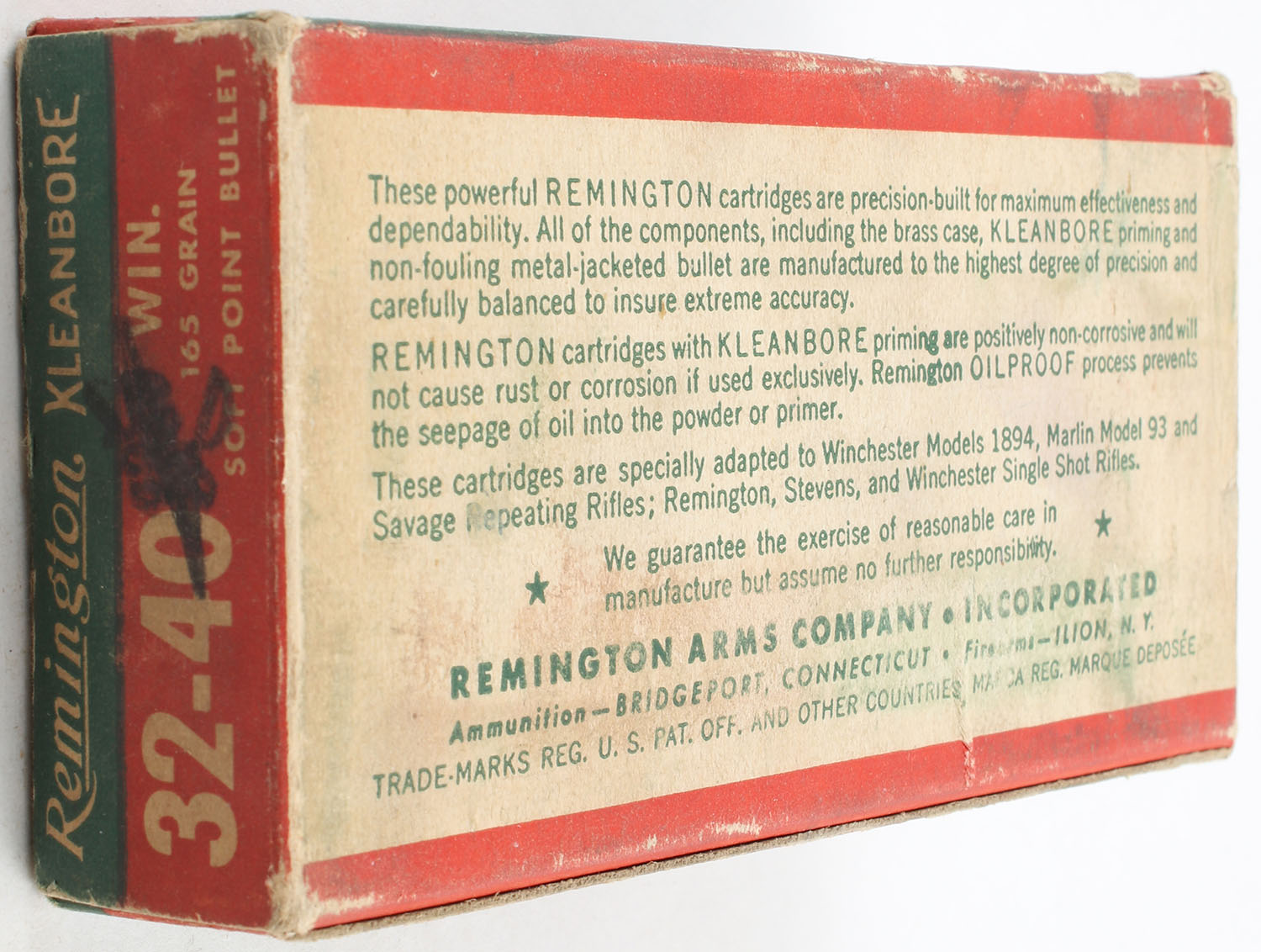 Remington, Kleanbore, .32-40 Winchester, 165 Grain Soft Point Bullet, Partial 19rds. 1pc. Green buff & red box, box is solid with good color, has light edge & corner wear, scuffing, end flaps are solid, ammo is excellent. Grade: Very Good ++ - Value: 60 to 90