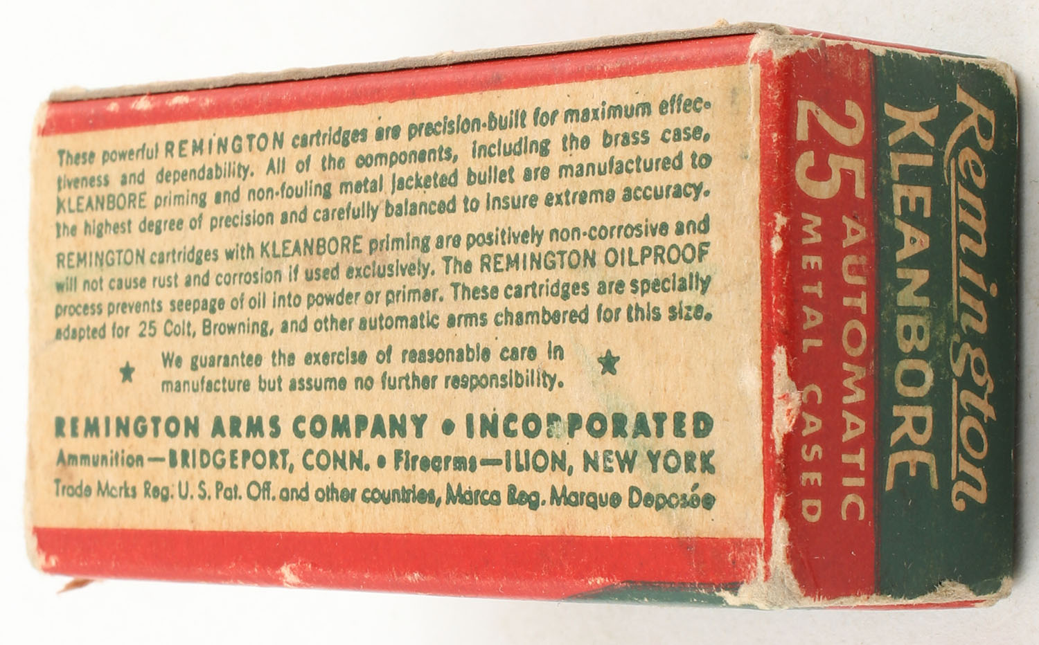 Remington, Kleanbore, .25 Automatic, 50 Grain Metal Cased Bullet, Partial 40rds., 1pc. Green buff & red box, box is solid with very good color, box is missing left end flap, light edge & corner wear, right flap is solid, ammo is excellent. Grade: Good ++ - Value: 10 to 20