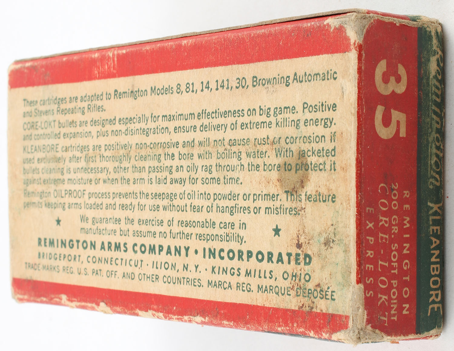 Remington, Kleanbore Express, .35 Remington, 200 Grain Soft Point Core-Lokt Bullet, Full, 1pc. Green red & white box, box is solid with good color, has edge & corner wear, scuffing, end flaps are solid, ammo is good to very good. Grade: Good ++ - Value: 30 to 80
