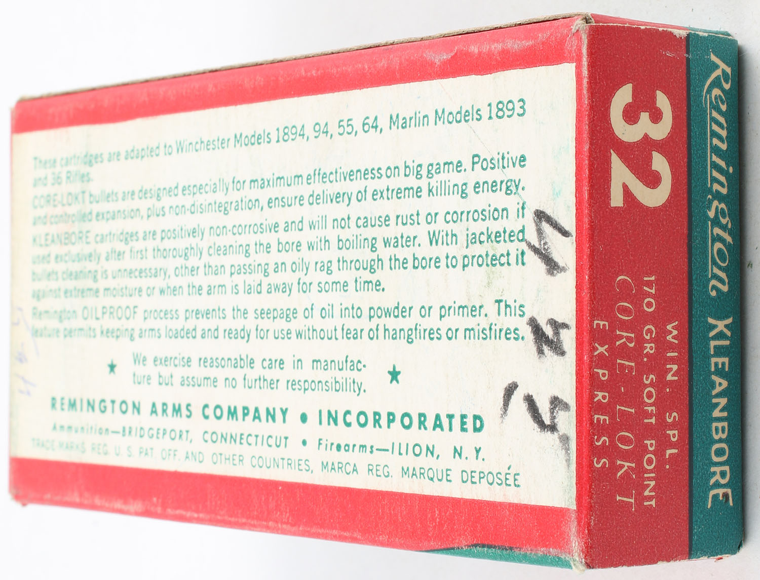 Remington, Kleanbore Express, .32 Winchester Special, 170 Grain Soft Point Core-Lokt Bullet, Full, 1pc. Green buff & red box, box is very solid with excellent color, has shelf wear, end flaps are solid, ammo is excellent. Grade: Excellent ++ - Value: 20 to 60