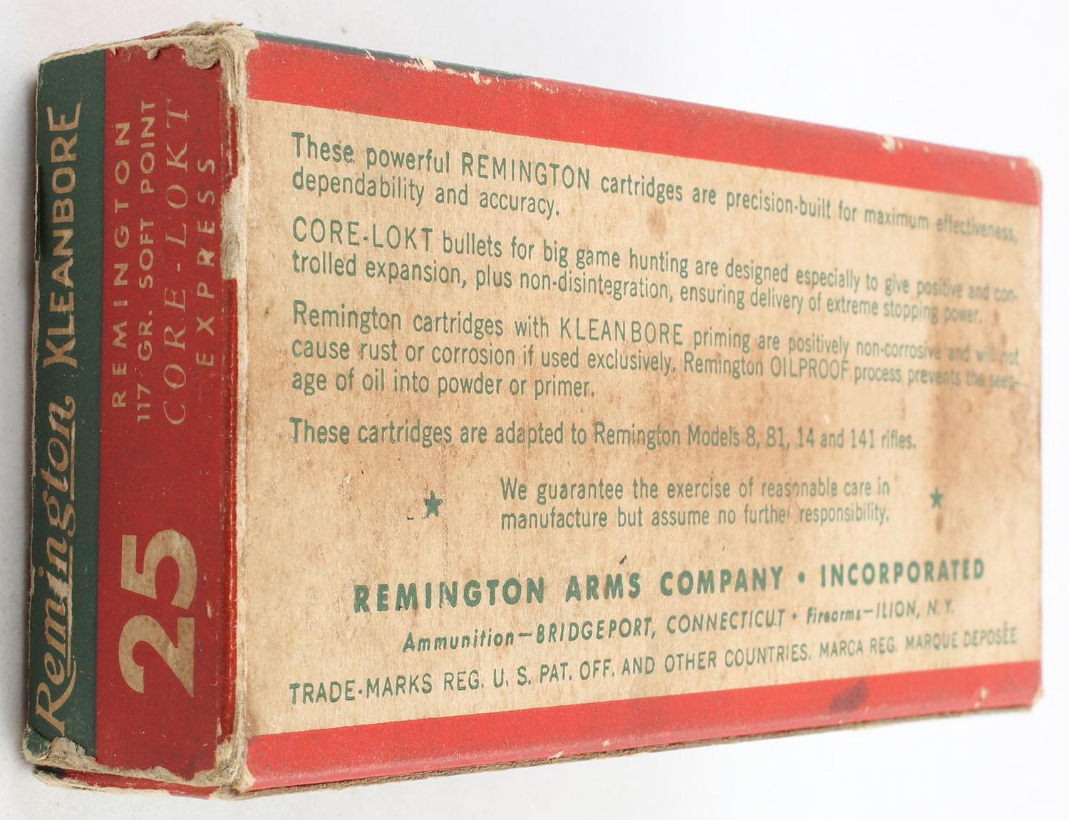 Remington, Kleanbore Express, .25 Remington, 117 Grain Soft Point, Full, 1pc. Green white & red box, box is solid with good color, edge & corner wear, scuffing to bottom, end flaps are solid, ammo is excellent. Grade: Very Good ++ - Value: 20 to 60