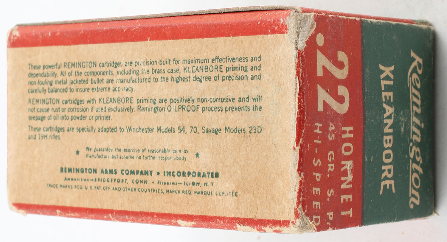 Remington, Kleanbore Hi-Speed, .22 Hornet, 45 Grain Soft Point, Full, 1pc. Green red & buff box, box is solid with good color, light edge & corner wear, end flaps are solid, ammo is excellent. Grade: Very Good ++ - Value: 60 to 90