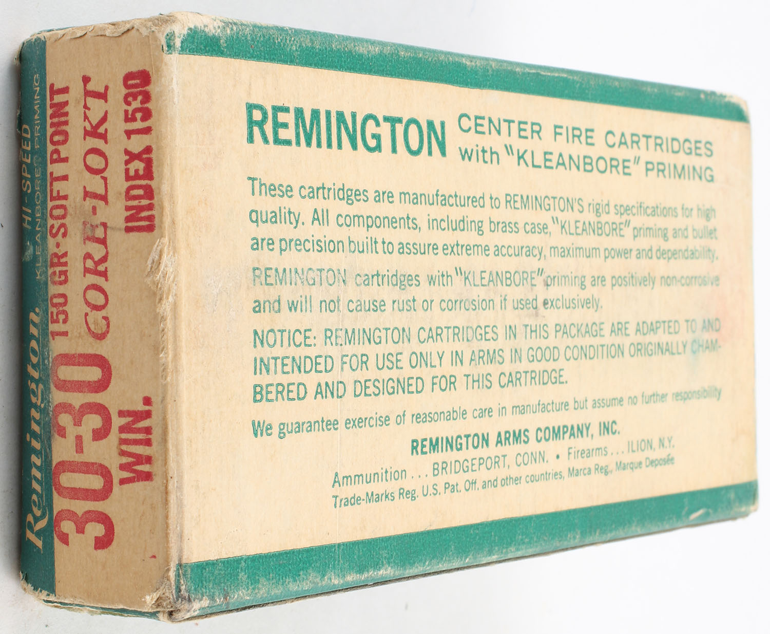 Remington, Hi-Speed, .30-30 Winchester, 150 Grain Soft Point, Core Lokt, Full of mixed ammo, 1pc. Green white & red box, box is solid with good color, has light age soiling, edge & corner wear, end flaps are solid, ammo is very good. Grade: Very Good - Value: 8 to 30