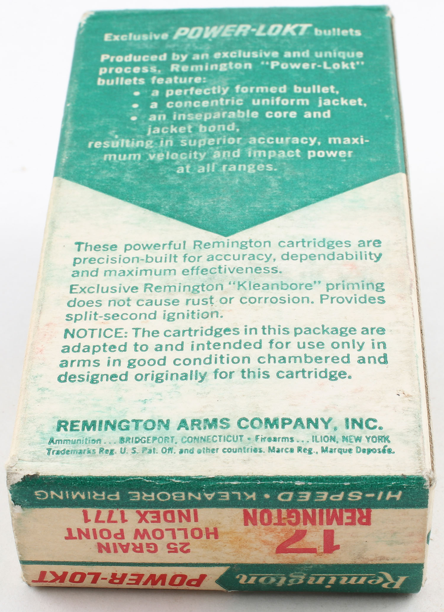 Remington, Power-Lokt, .17 Remington, 25 Grain Hollow Point, Full, 1pc. White green & red box, box is solid with very good color, has light scuffing, minor edge & corner wear, end flaps are solid, ammo is excellent. Grade: Very Good ++ - Value: 30 to 60