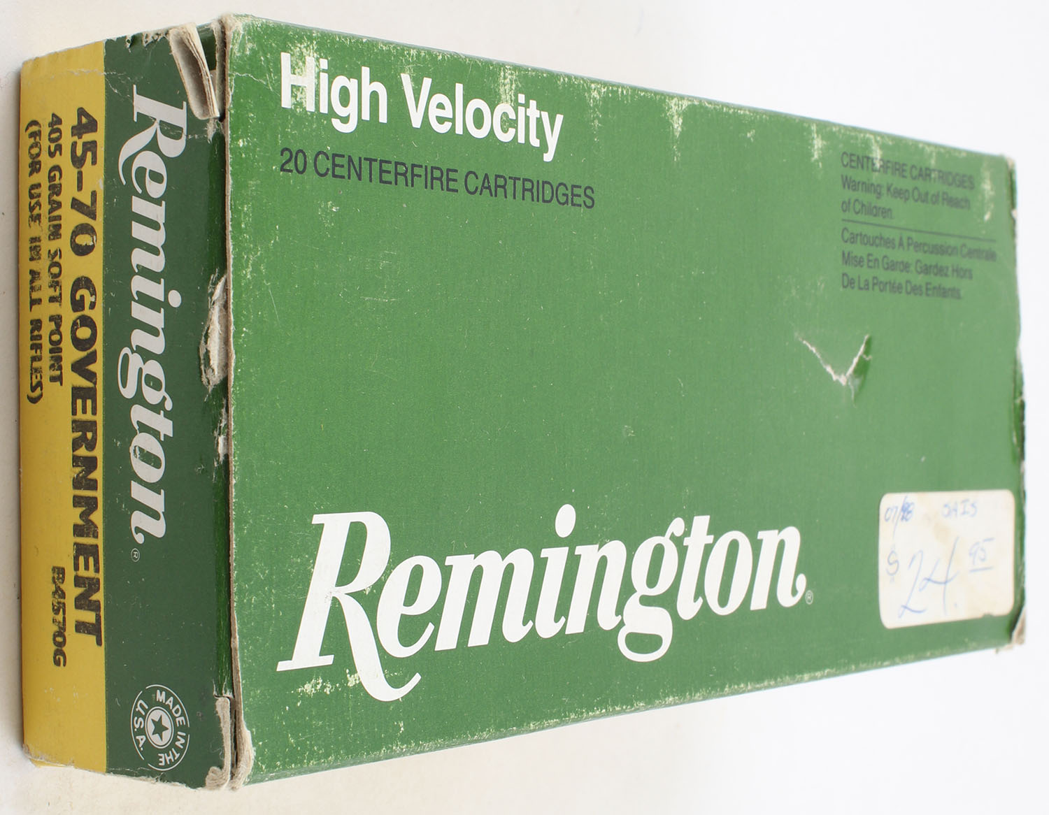 Remington, High Velocity, .45-70 Government, 405 Grain Soft Point, Full, 1pc. Green yellow & white box, box is solid with good color, has scuffing with corner wear, light edge wear, end flaps are solid, ammo is excellent. Grade: Very Good + - Value: 20 to 60