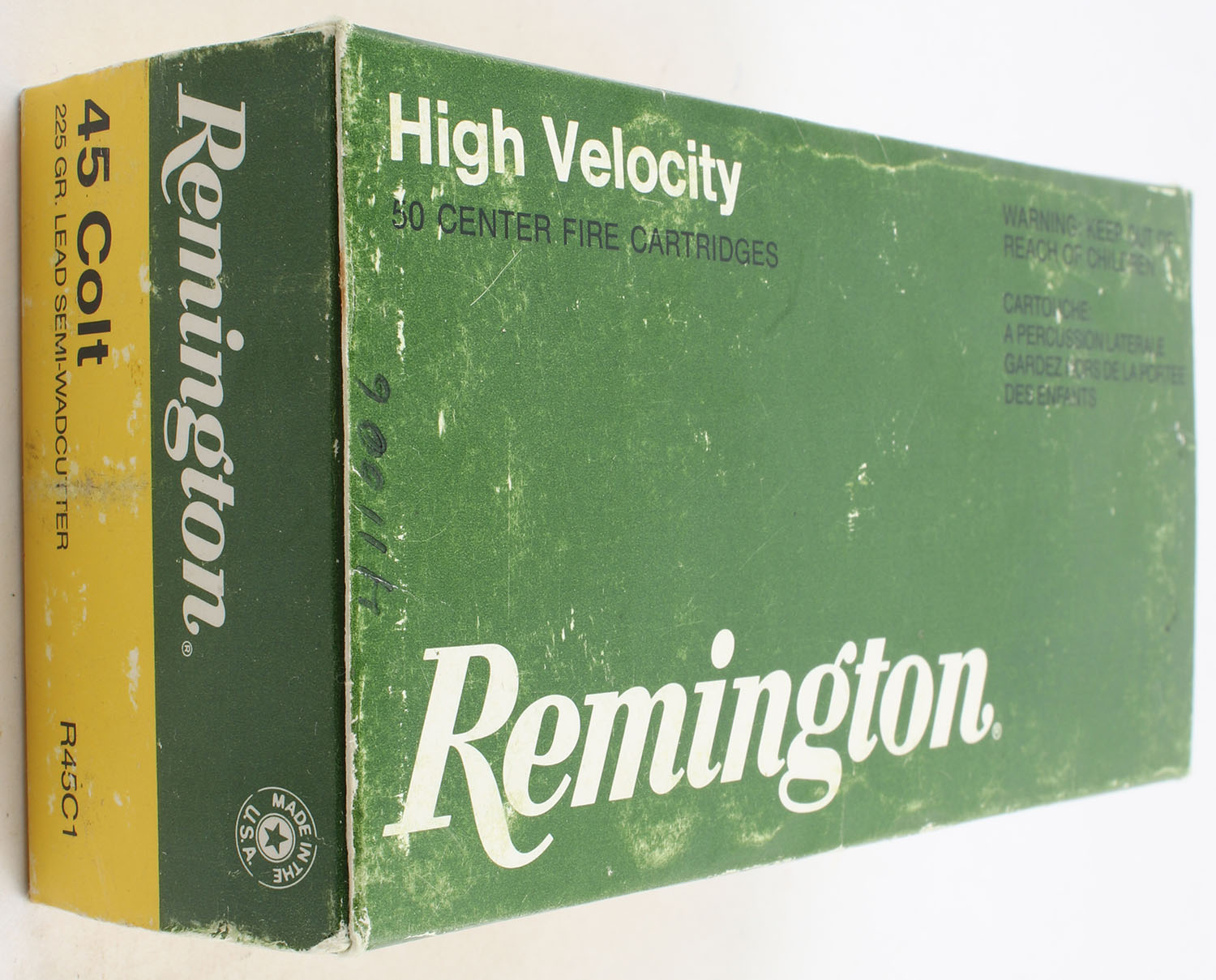 Remington, High Velocity, .45 Colt, 225 Grain Lead Semi-Wadcutter, Partial 41rds., 1pc. Green white & yellow box, box is solid with very good color, has light scuffing to top, light edge & corner wear, end flaps are solid, ammo is excellent. Grade: Excellent - Value: 40 to 60
