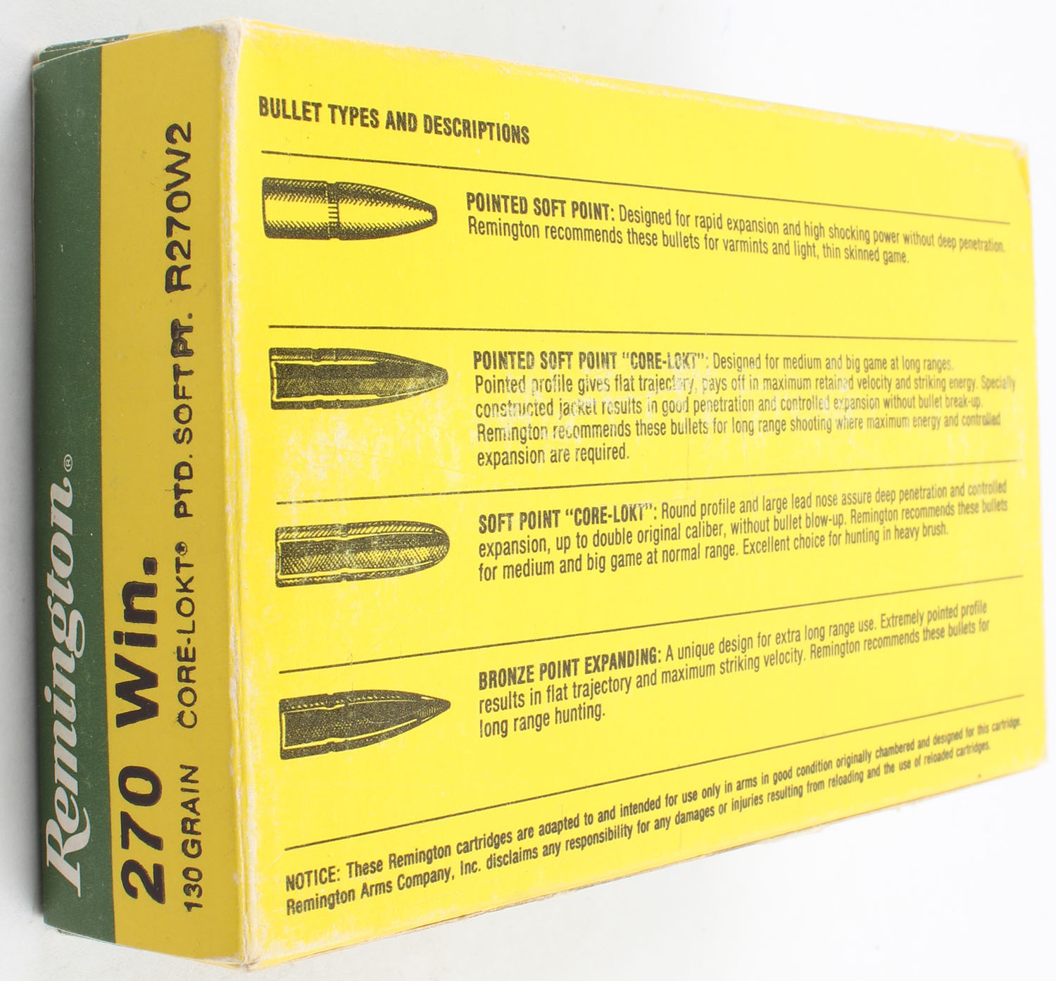 Remington, High Velocity, .270 Winchester, 130 Grain Core Lokt PTD. Soft Point, Full, 1pc. Green & yellow box, box is very solid with good color, has light edge & corner wear, minor scuffing, end flaps are solid, ammo is excellent. Grade: Excellent - Value: 10 to 40