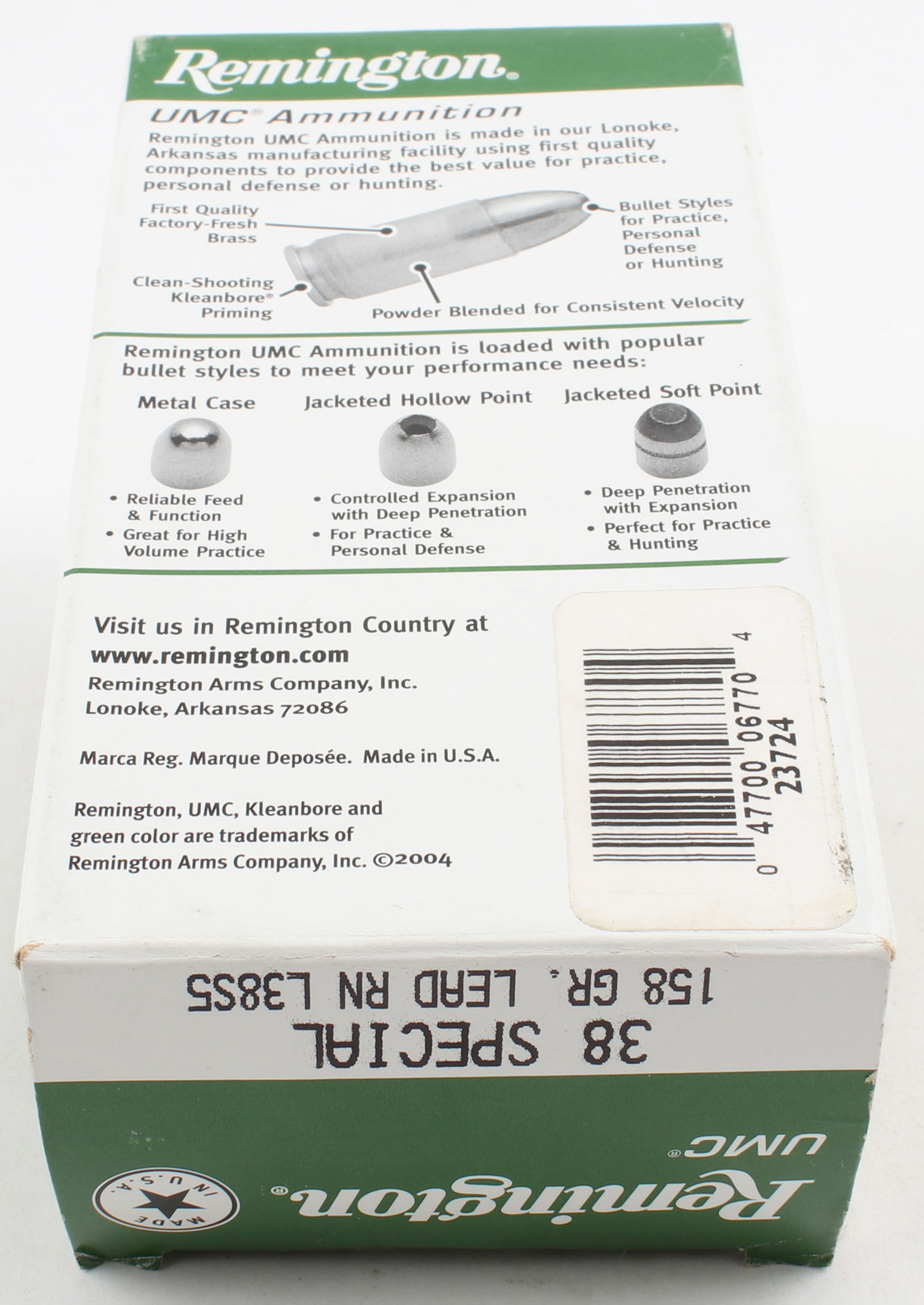 Remington, UMC, .38 Special, 158 Grain Lead RN., Full, 1pc. Green white & black box, box is very solid with excellent color, end flaps are solid, ammo is excellent. Grade: Excellent ++ - Value: 20 to 30