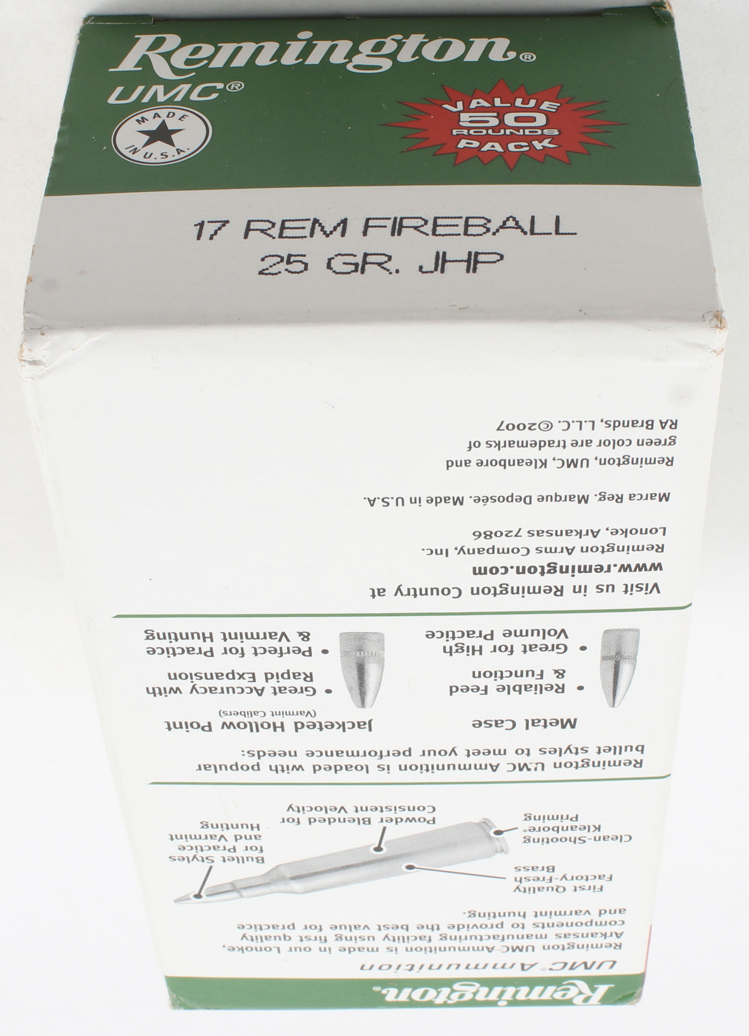 Remington, UMC, .17 Rem. Fireball, 25 Grain JHP., Full, 1pc. Green, white & black box, box is very solid with excellent color, end flaps are solid, ammo is excellent. Grade: Excellent + - Value: 20 to 60