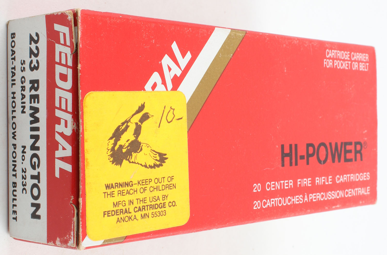 Federal, Hi-Power, .223 Remington, 55 Grain Boat Tail Hollow Point Bullet, Full, 1pc. Multi-colored box, box is very solid with very good color, ammo is excellent. Grade: Excellent + - Value: 10 to 40