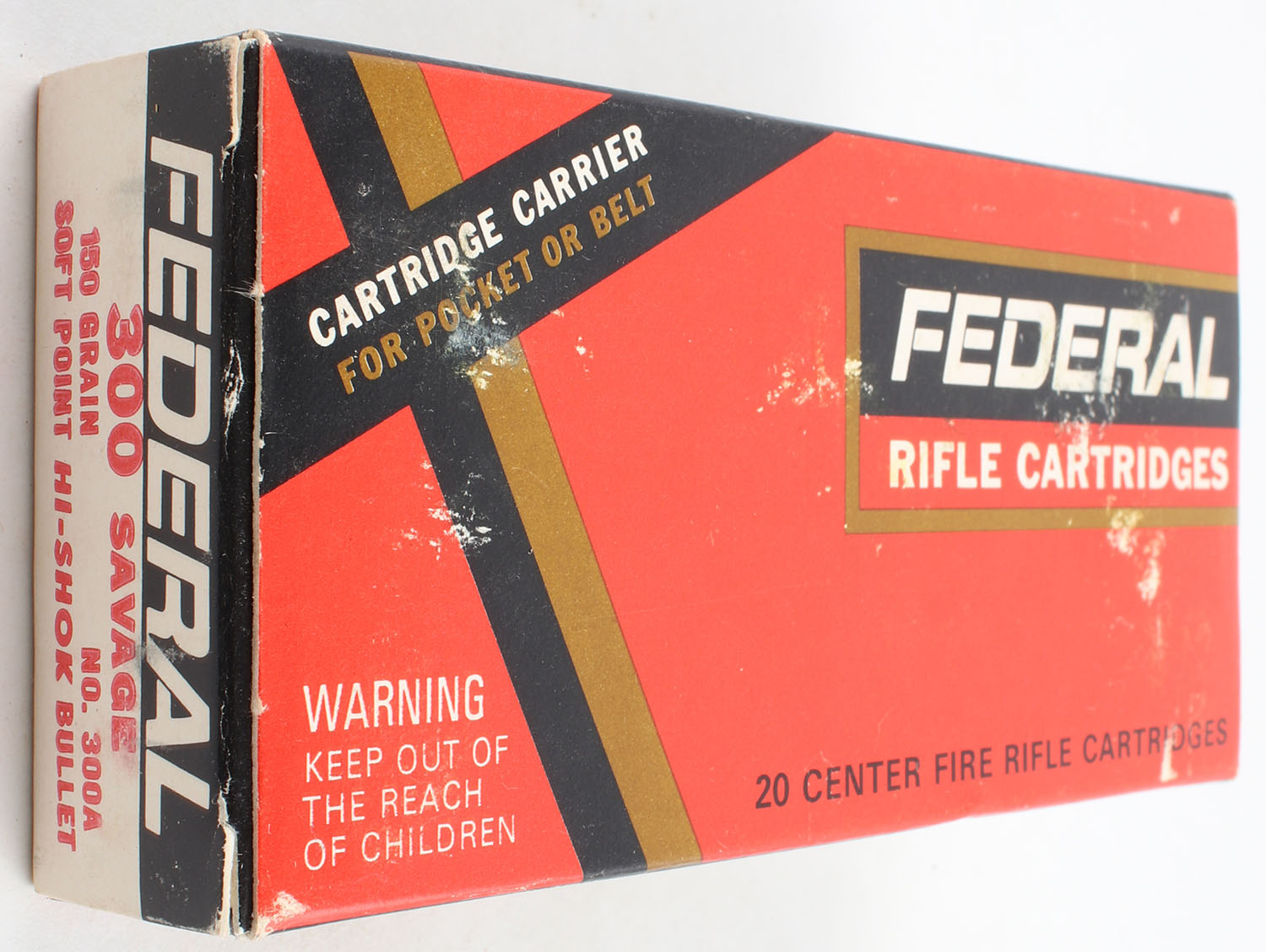 Federal, Rifle Cartridges, .300 Savage, 150 Grain Soft Point Hi Shok, Full, 1pc. Multi-colored box, box is solid with very good color, has light shelf wear, ammo is excellent. Grade: Excellent - Value: 20 to 40