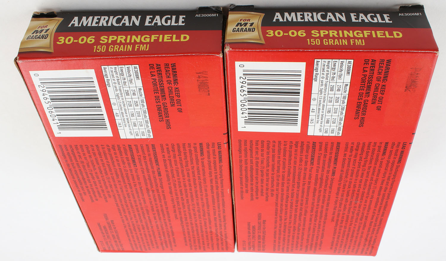 Federal, Lot of (2), American Eagle, .30-06 Springfield, 150 Grain FMJ, Full, 1pc. Multi-colored boxes, boxes are very solid with excellent color, end flaps are solid, ammo is excellent. Grade: Excellent + - Value: 30 to 60