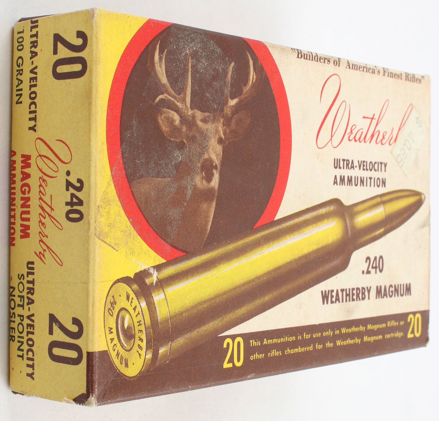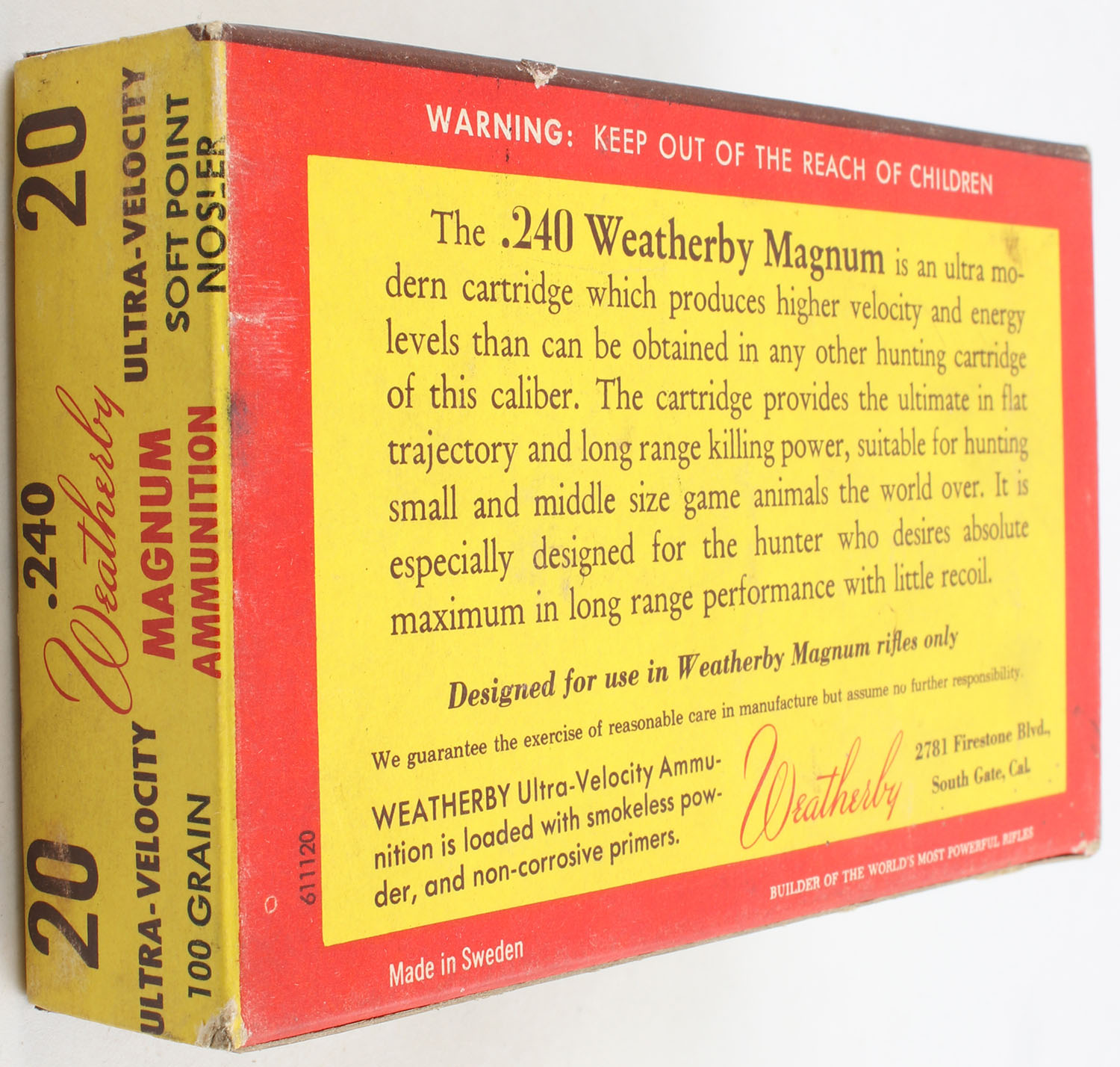 Weatherby, Ultra-Velocity, .240 Weatherby Magnum, 100 Grain Soft Point Nosler, Full, 1pc. Multi-colored box, box is solid with very good color, has shelf wear, light scuffing, end flaps are solid, ammo is excellent. Grade: Excellent - Value: 30 to 90