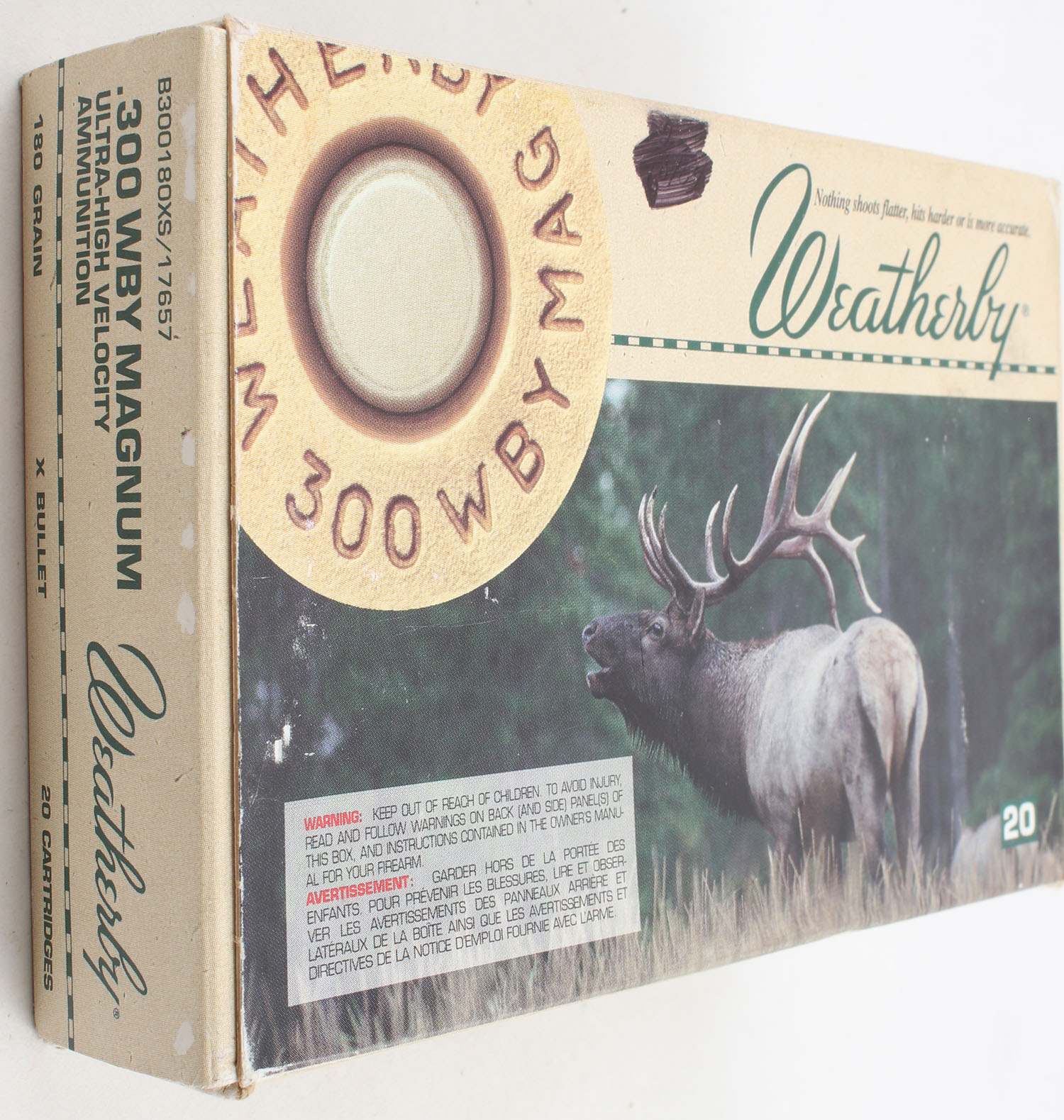 Weatherby, Ultra High Velocity, .300 Weatherby Magnum, 180 Grain X Bullet, Full, 1pc. Multi-colored Elk Box, box is solid with excellent color, has minor scuffing, end flaps are solid, ammo is minty. Grade: Excellent - Value: 40 to 80