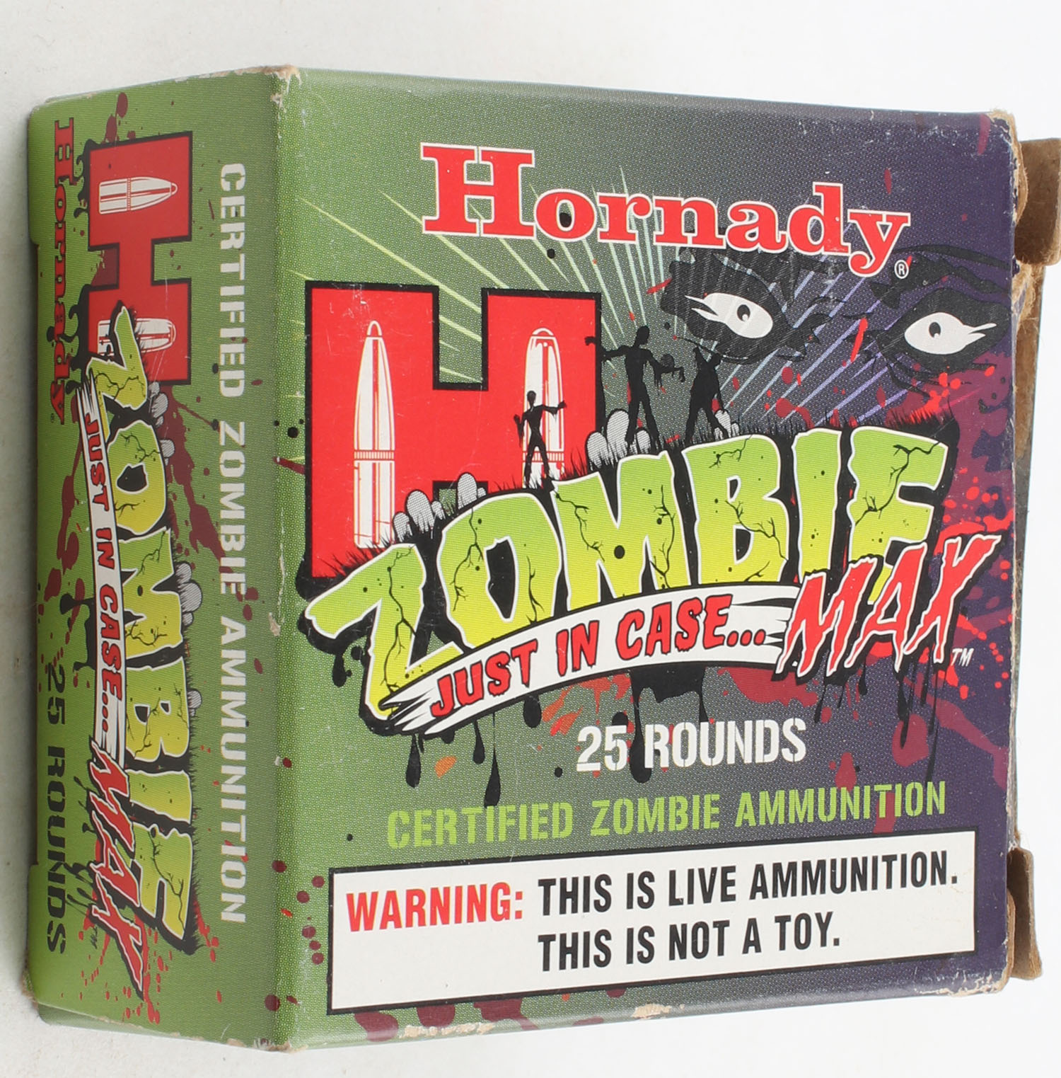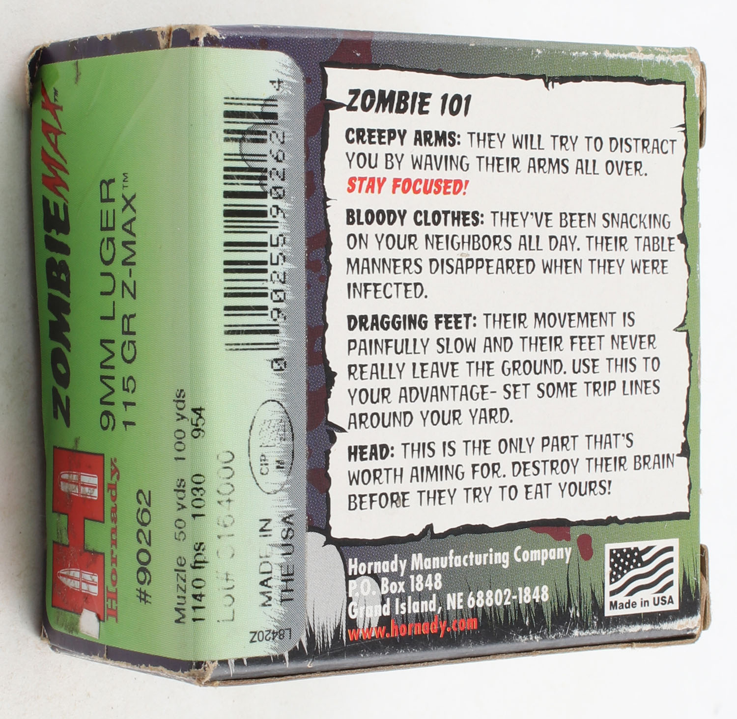 Hornady, Zombie Max, 9mm Luger, 115 Grain Z-Max, Full, 1pc. Multi-colored box, box is very solid with excellent color, right end flap has a small tear, ammo is excellent. Grade: Excellent - Value: 30 to 45