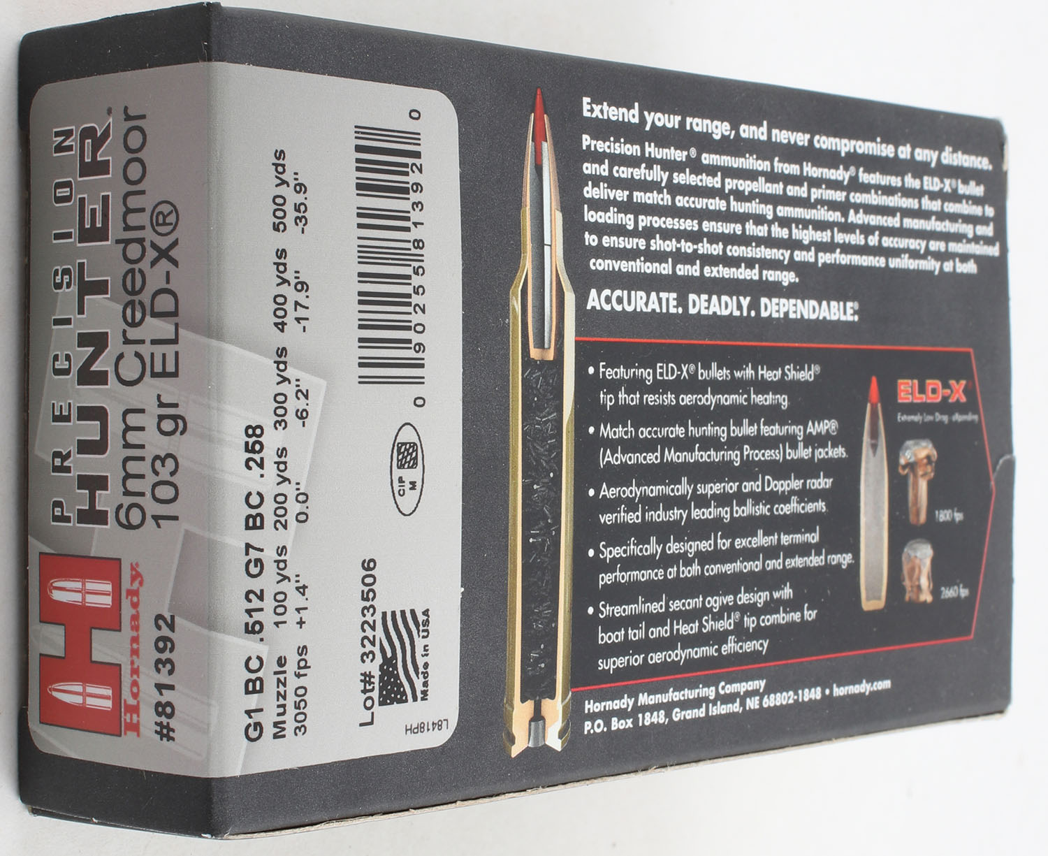 Hornady, Precision Hunter, 6mm Creedmoor, 103 Grain ELD-X, Full, 1pc. multi-colored box, box is solid with excellent color, ammo is mint. Grade: MINT - Value: 20 to 30