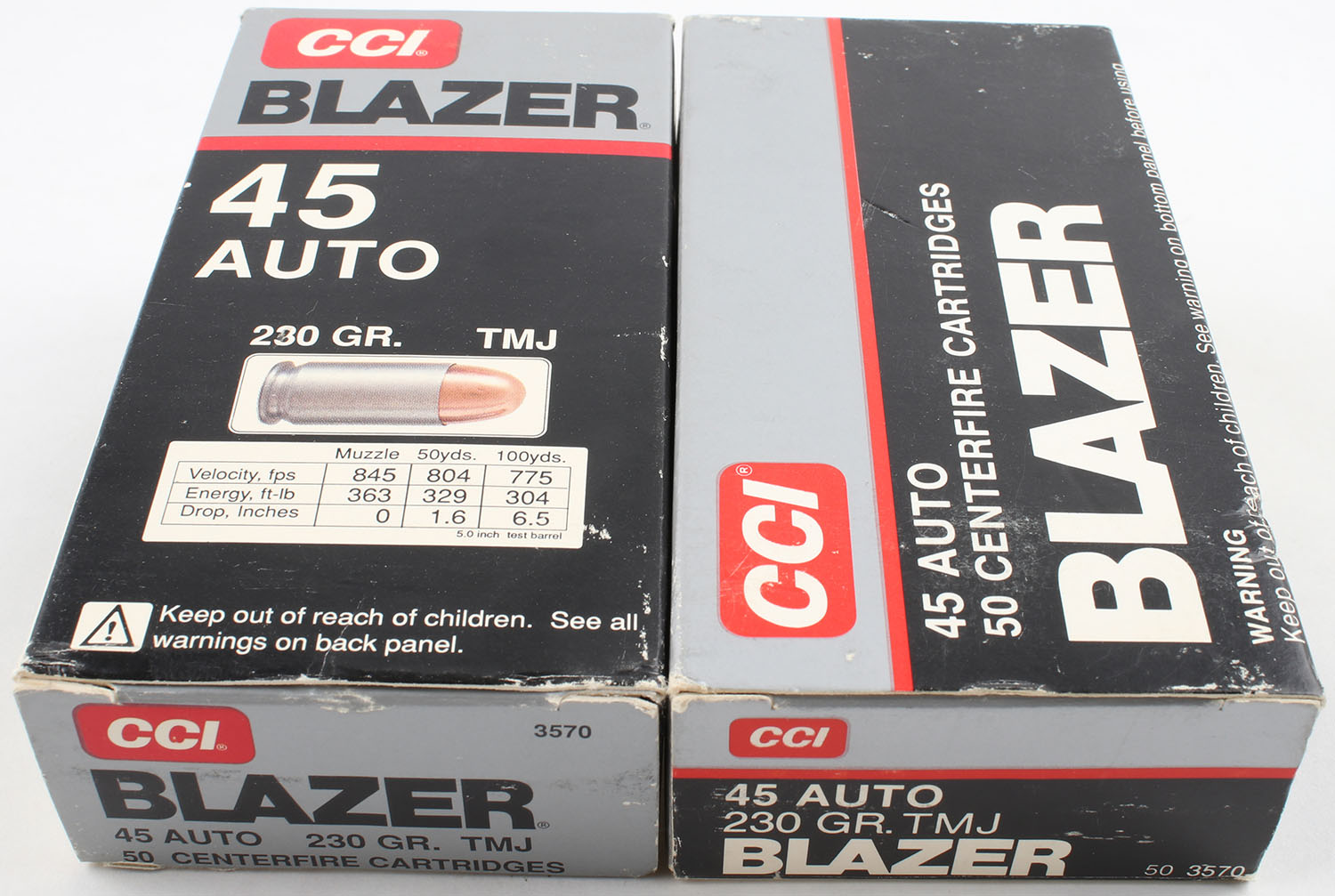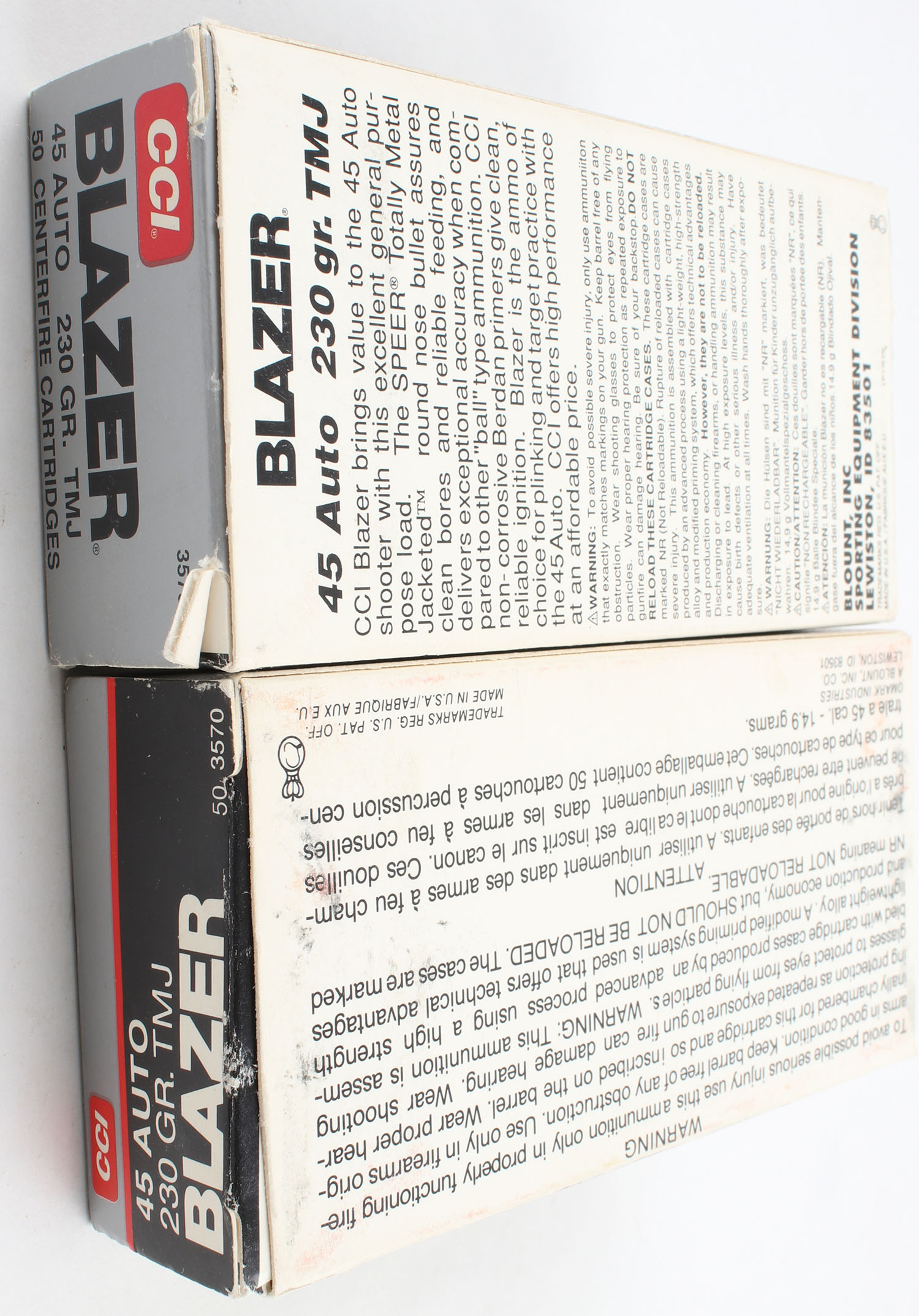 CCI, Lot of (2), Blazer, .45 Auto, 230 Grain TMJ, (1) Box is Full (1) Box is Partial 44rds., 1pc. multi-colored boxes, boxes have light scuffing, ammo is excellent. Grade: Excellent - Value: 16 to 50