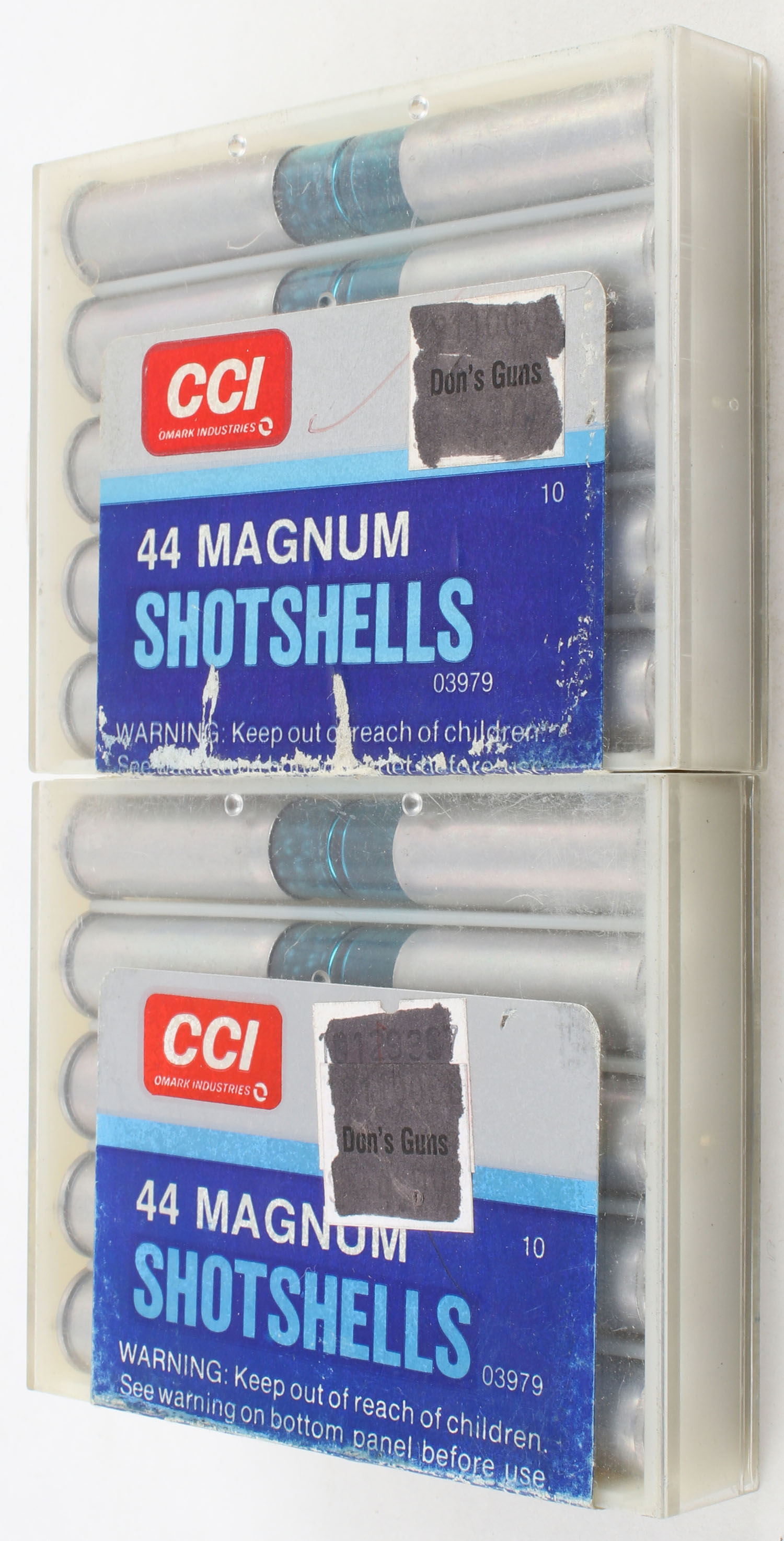 CCI, Lot of (2), .44 Magnum Shotshells, Full, 1pc. Multi-colored boxes, ammo is excellent. Grade: Excellent - Value: 20 to 40
